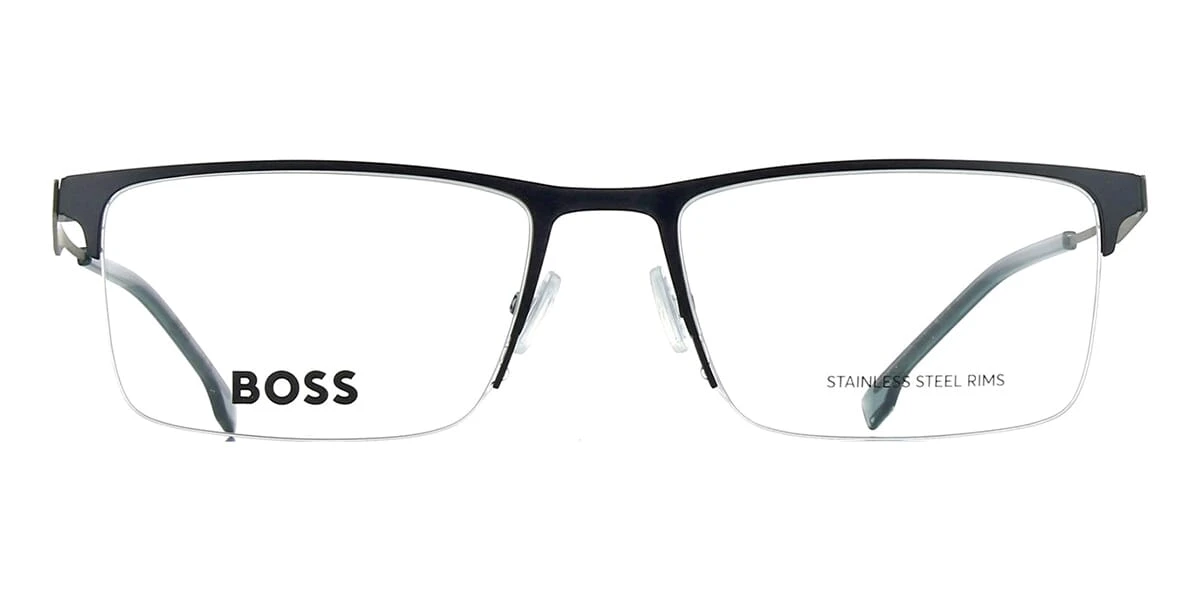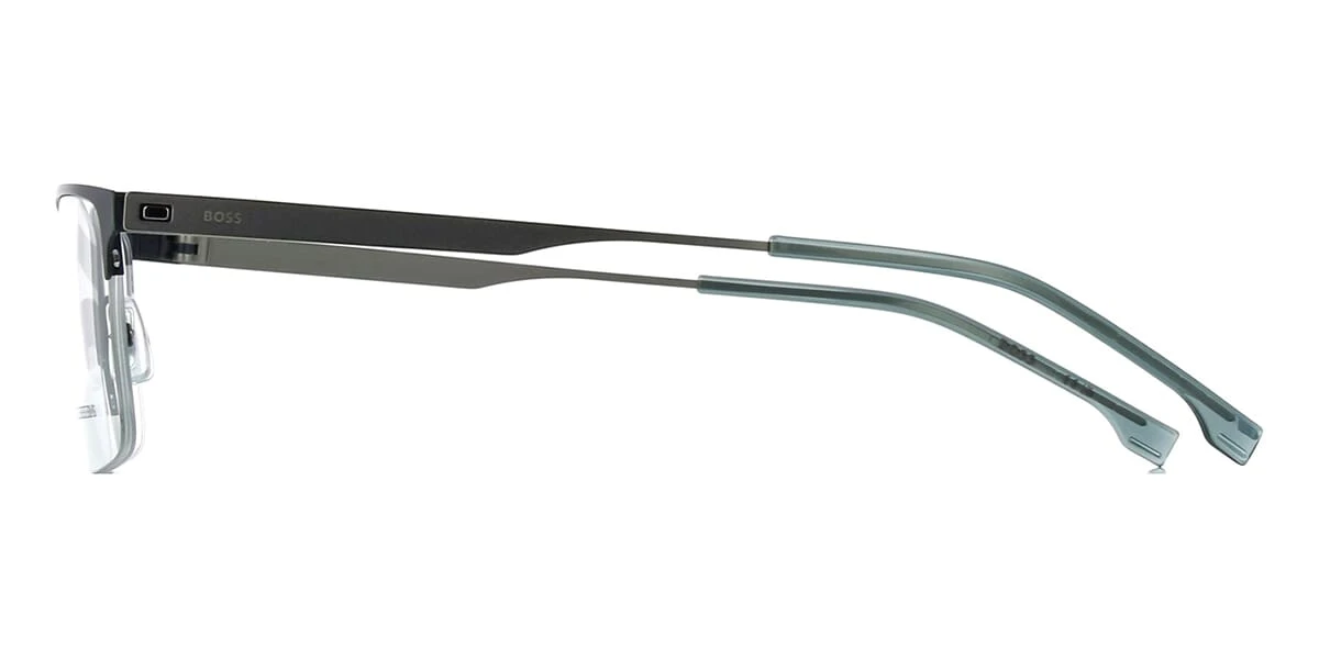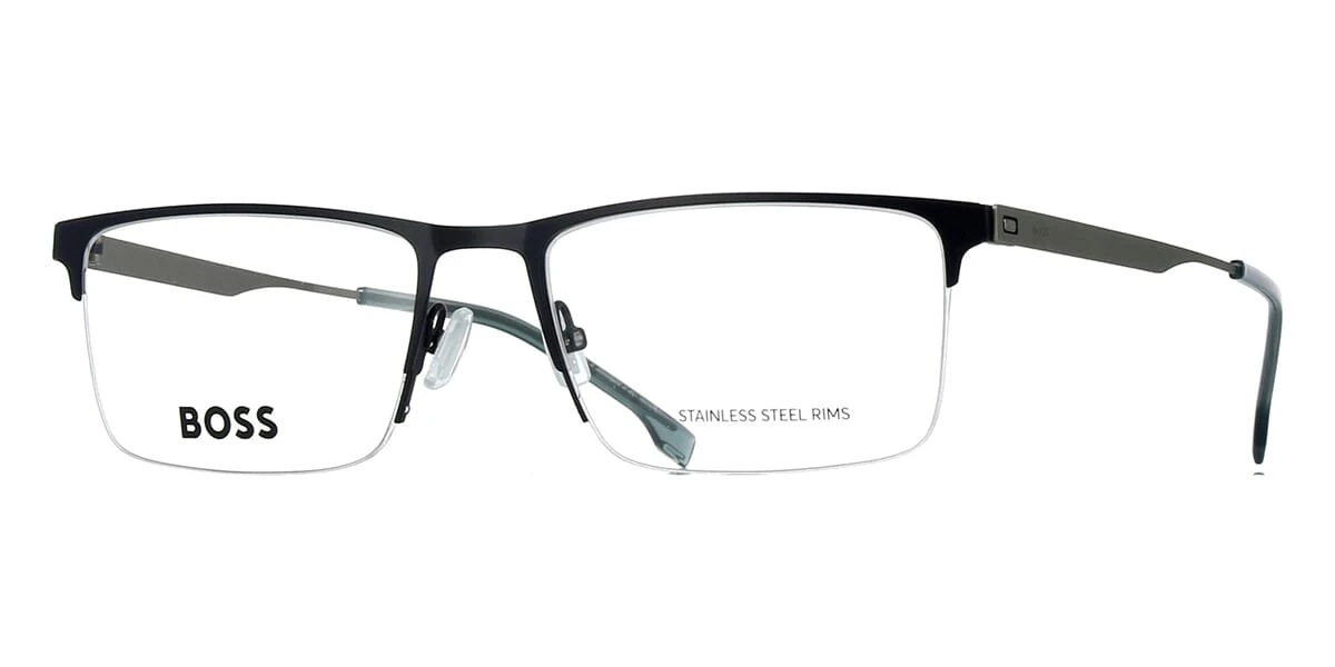 This square Hugo Boss optical comes in a matte blue and ruthenium frame.