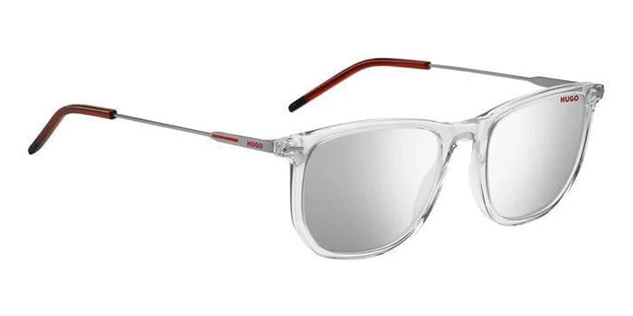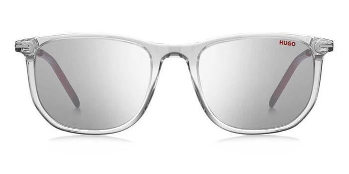 This square Hugo Boss sunglass comes in a crystal frame with grey with flashed silver lenses.