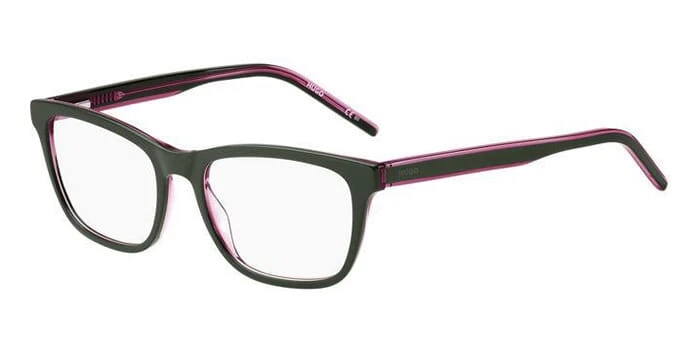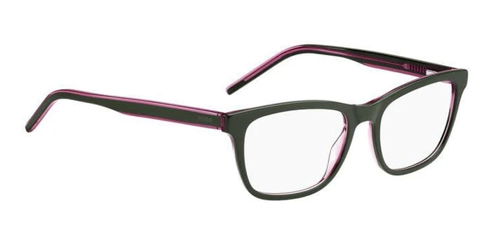 This rectangular Hugo Boss optical comes in a green and pink frame.