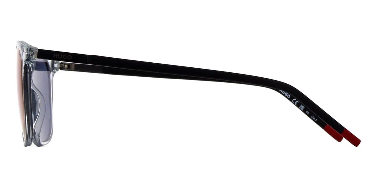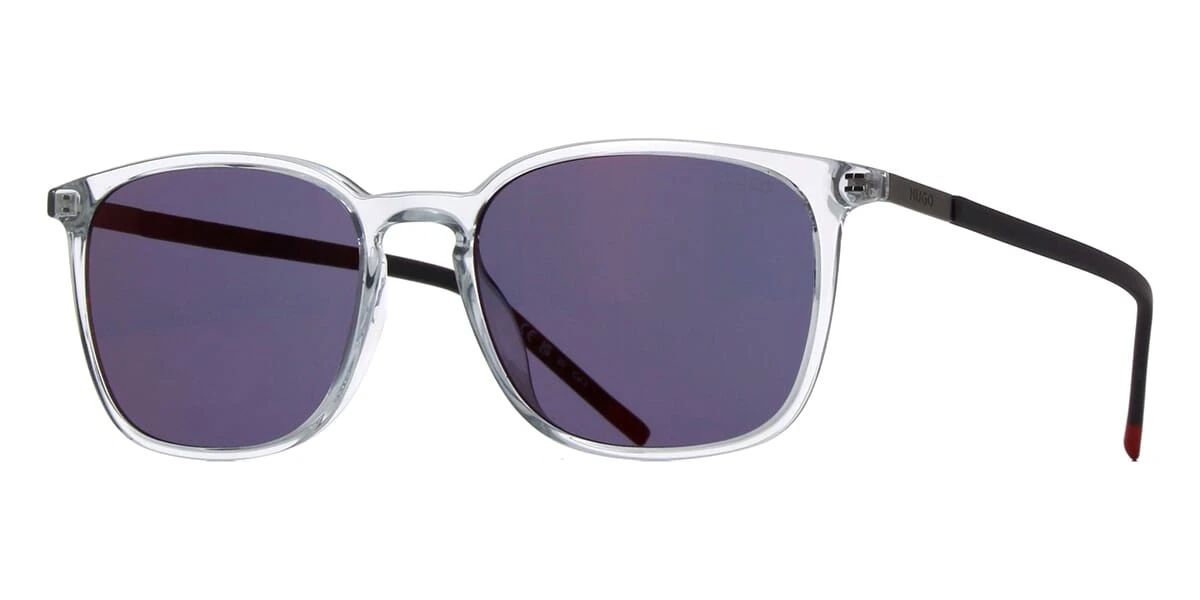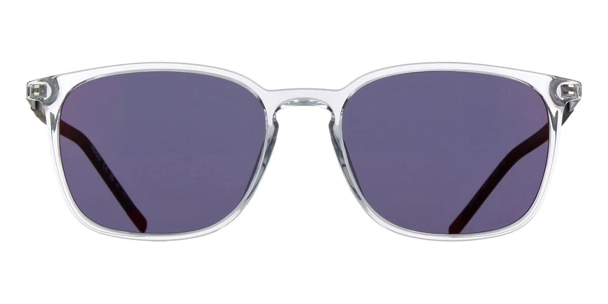 This square Hugo Boss sunglass comes in a grey crystal frame with grey with red mirror lenses.