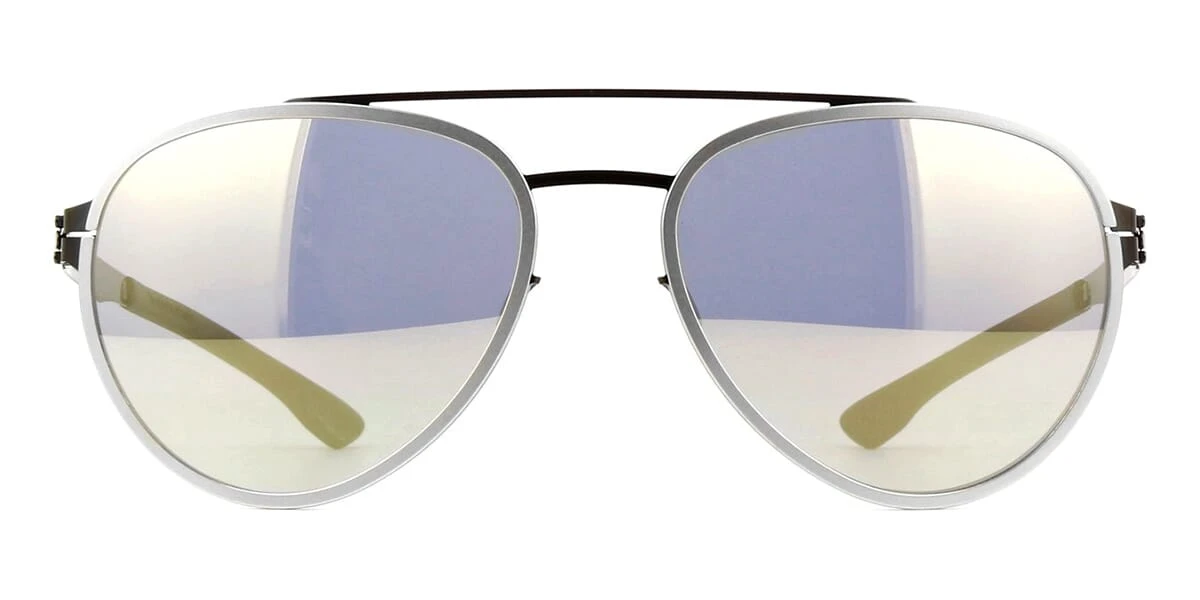 This aviator ic! berlin sunglass comes in a gunmetal and pearl with black frame with quicksilver lenses.