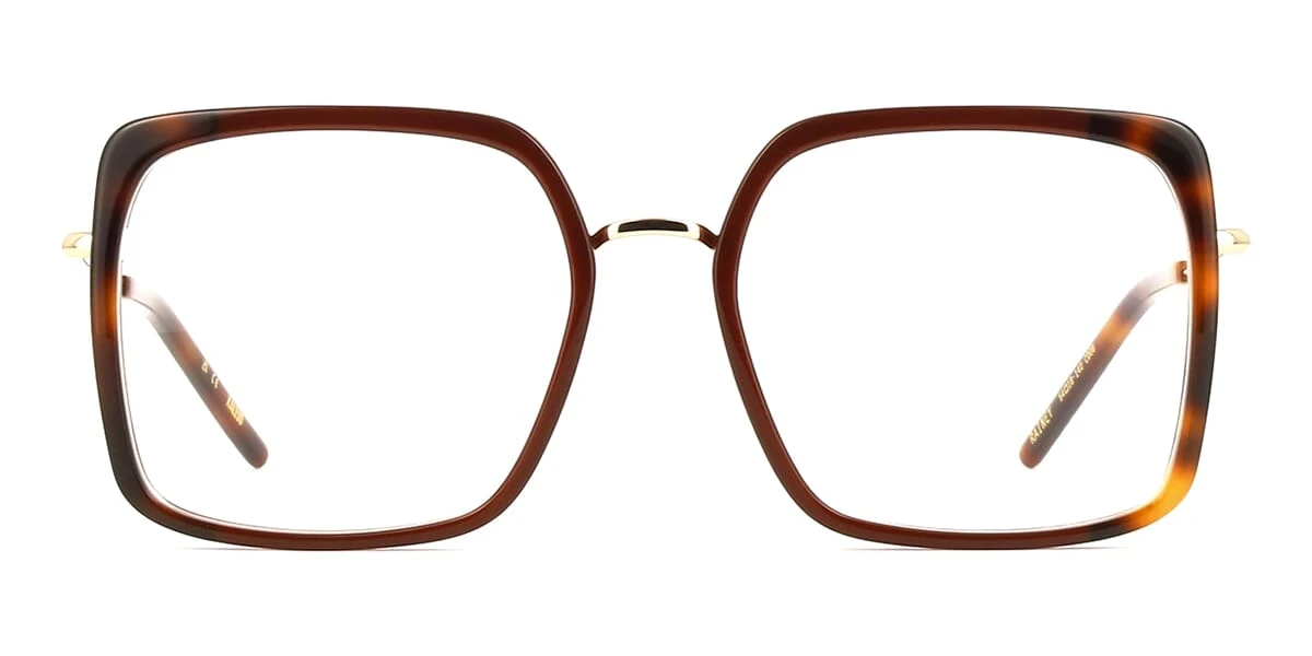 This square Kaleos optical comes in a shiny dark havana and gold frame.