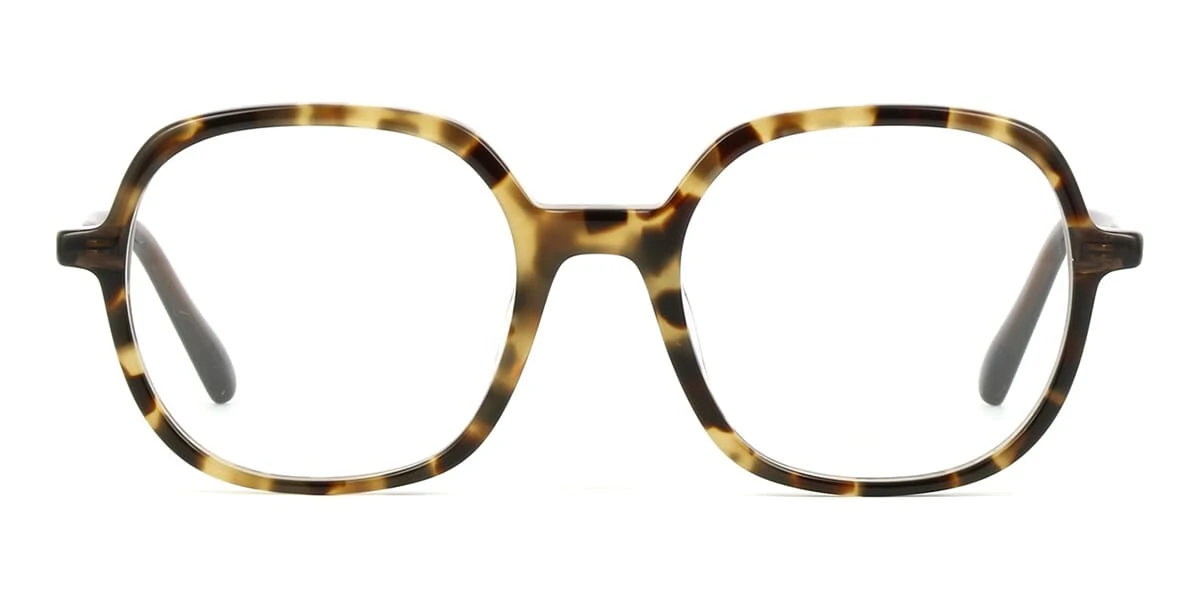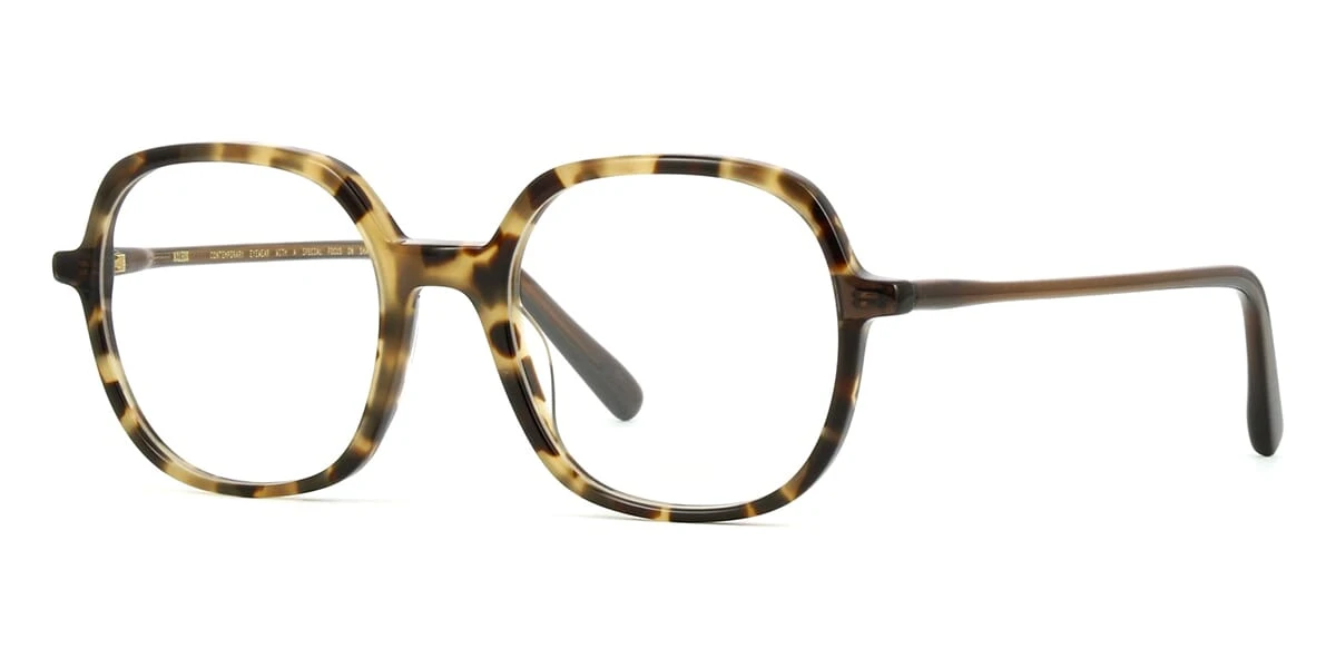 This square Kaleos optical comes in a shiny dark spotted havana frame.