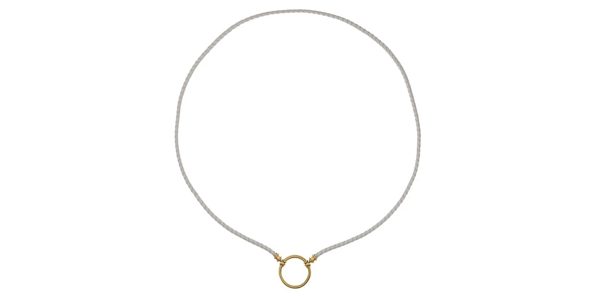 This round La Loop optical comes in a 25” white italian braided leather with satin 24k gold loop frame.