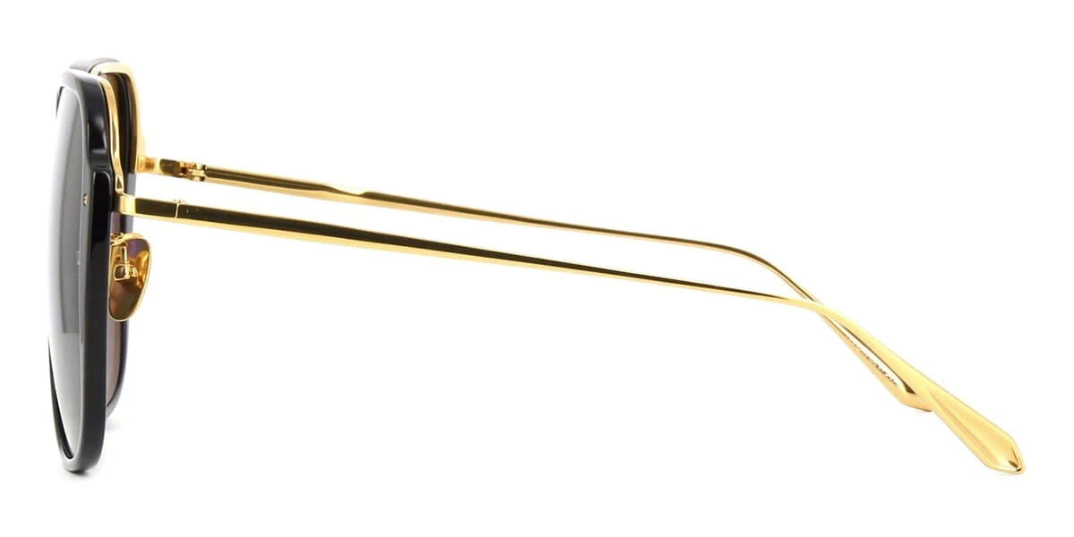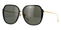 This square Linda Farrow sunglass comes in a shiny black and gold frame with grey with light mirror lenses.