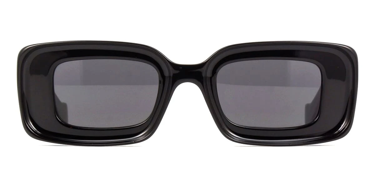 This square Loewe sunglass comes in a shiny black frame with dark grey lenses.