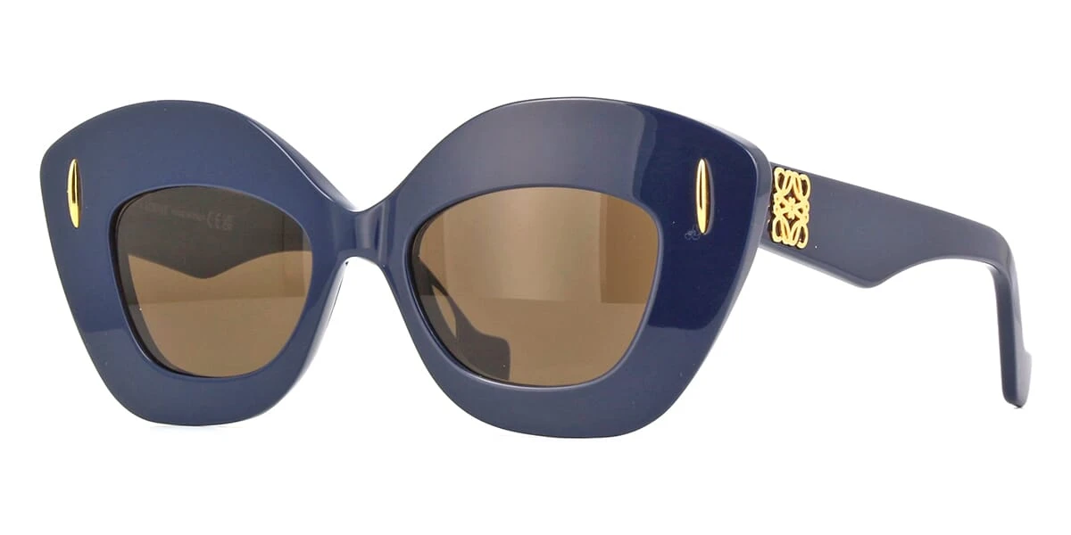 This cat eye Loewe sunglass comes in a dark blue frame with brown with light mirror lenses.
