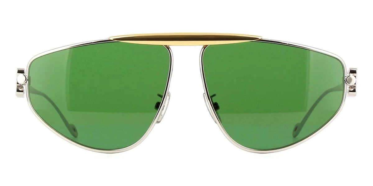 This cat eye Loewe sunglass comes in a shiny silver and gold frame with green with light mirror lenses.