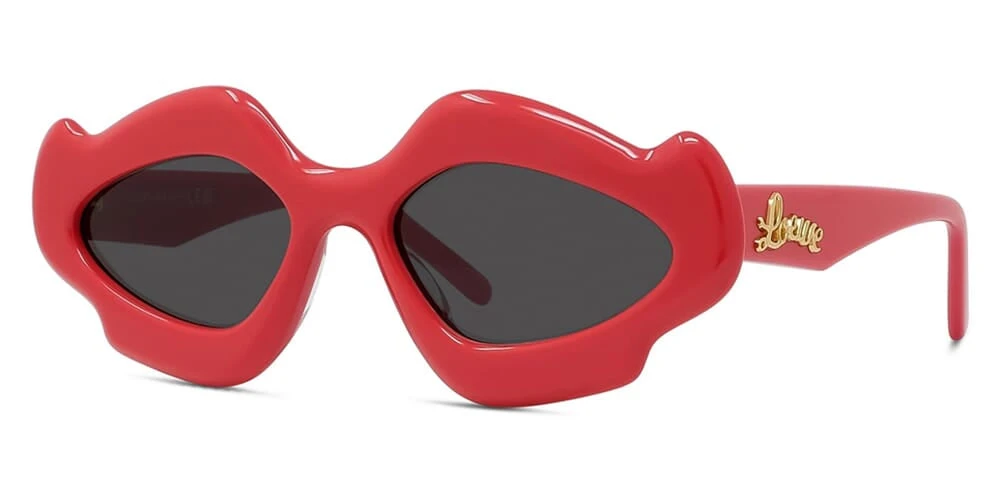 This cat eye Loewe sunglass comes in a shiny solid red frame with solid smoke grey lenses.