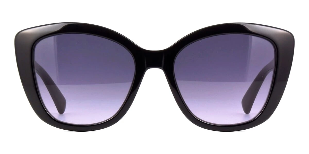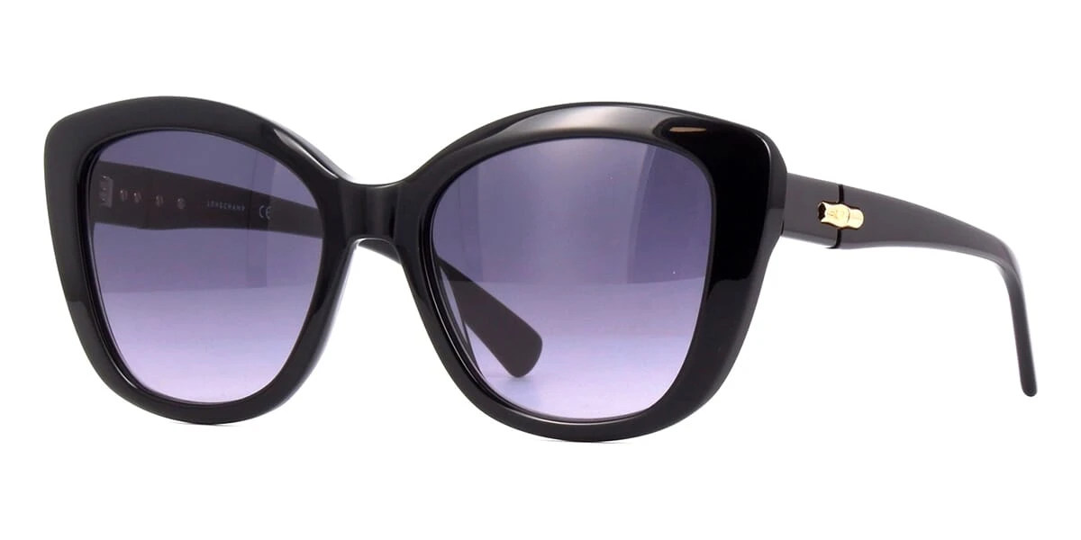 This cat eye Longchamp sunglass comes in a shiny black frame with grey smoke gradient lenses.