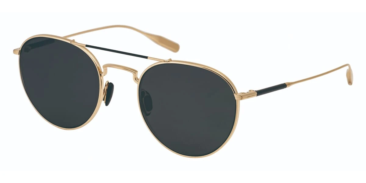 This square Masunaga sunglass comes in a gold frame with grey lenses.