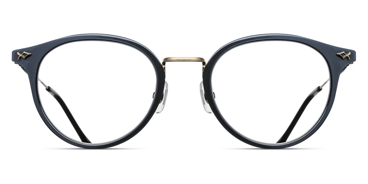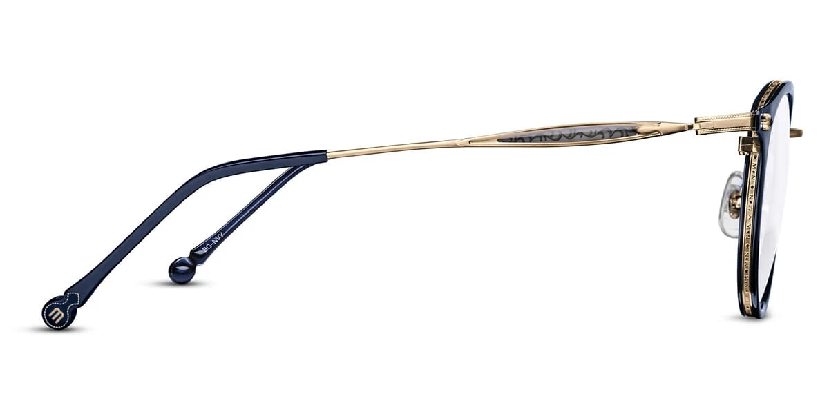 This round Matsuda optical comes in a brushed gold with navy frame.