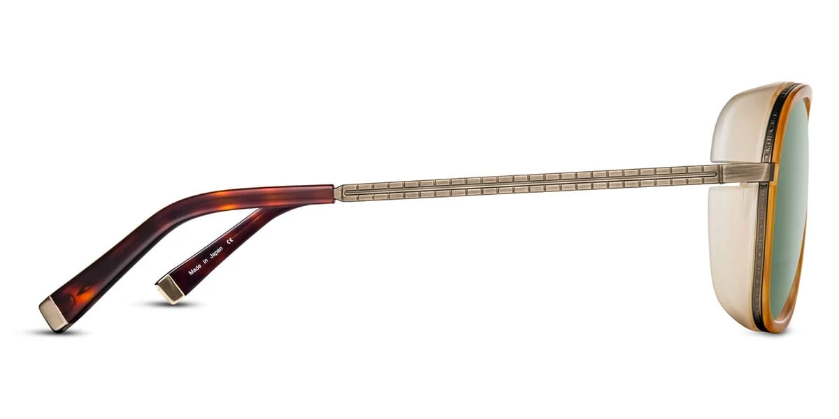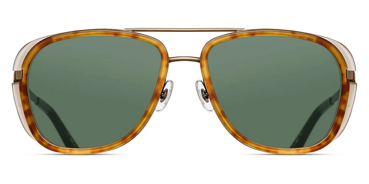 This square Matsuda sunglass comes in a demi natural/antique gold frame with g-15 green solid tint lenses.