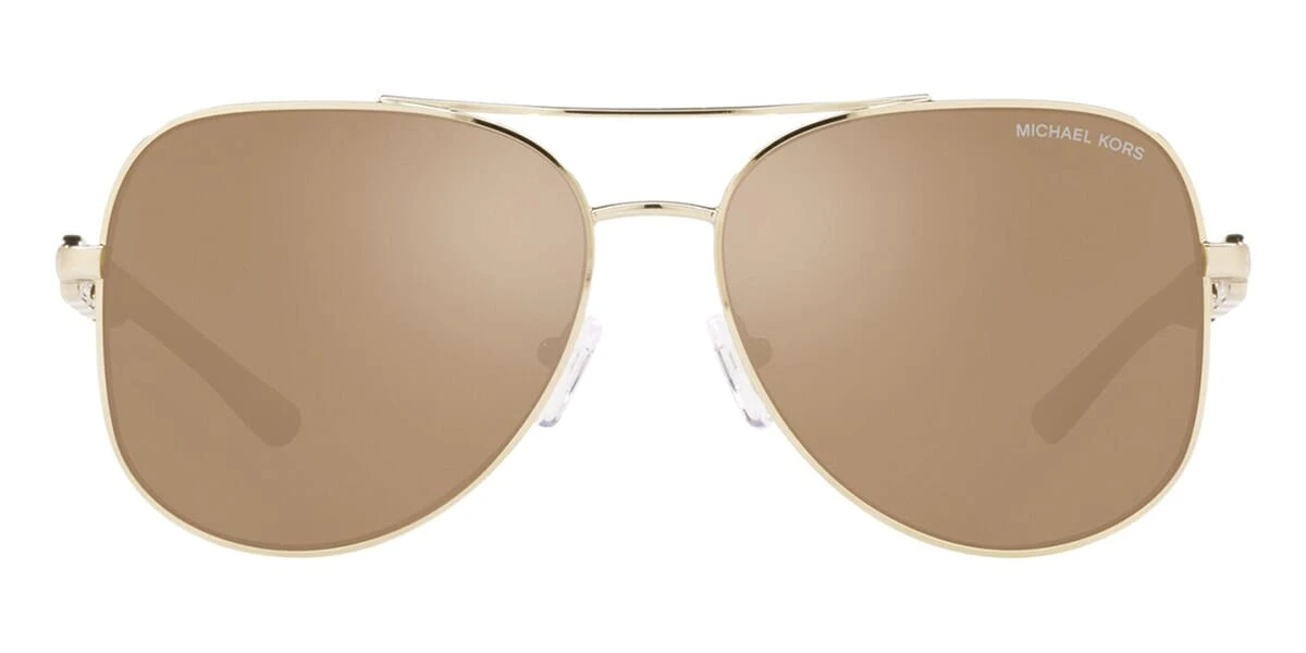 This aviator Michael Kors sunglass comes in a light gold frame with brown with gold mirror lenses.