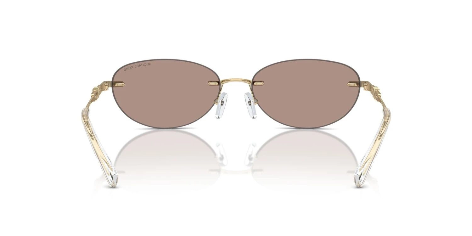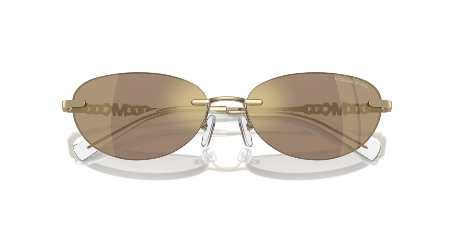 This round Michael Kors sunglass comes in a gold frame with brown with gold mirror lenses.