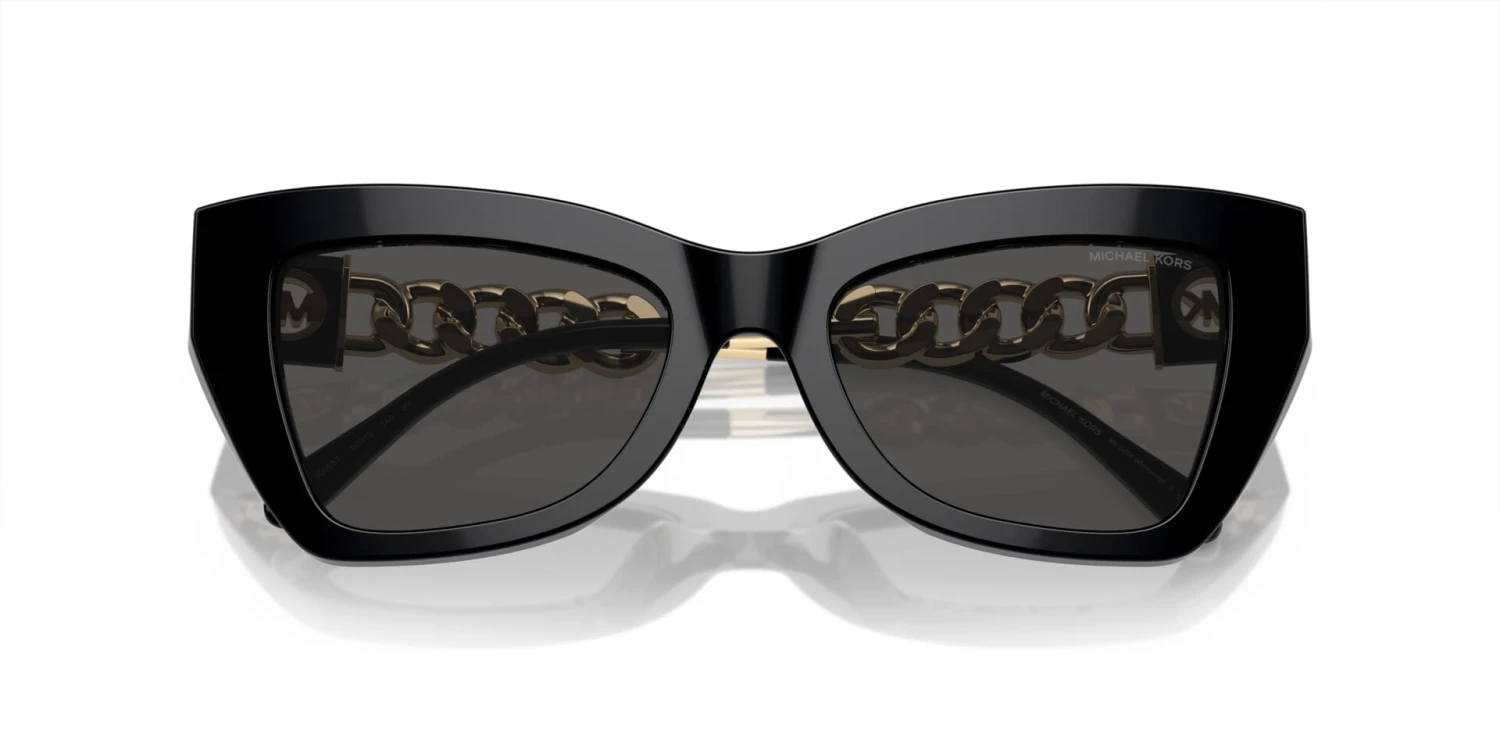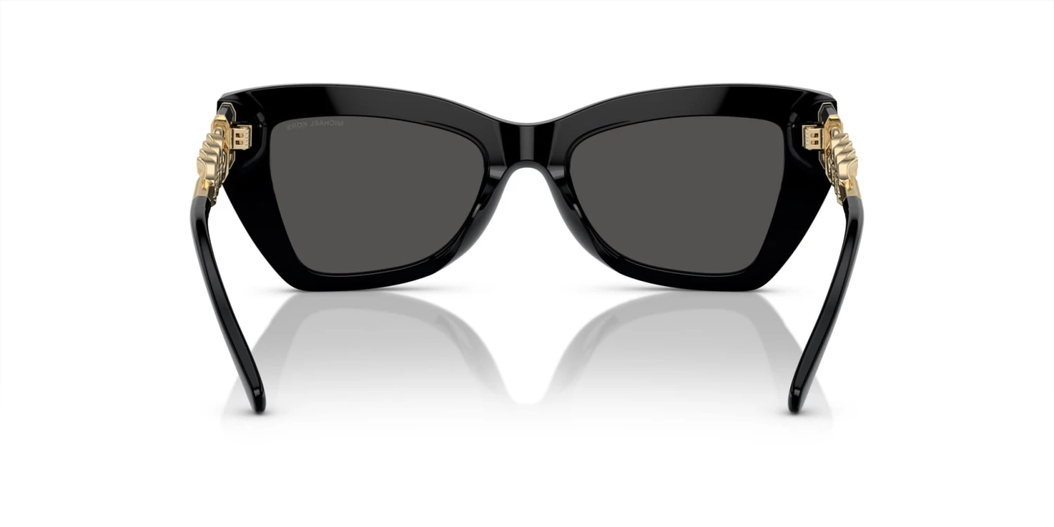 This cat eye Michael Kors sunglass comes in a black frame with dark grey solid lenses.