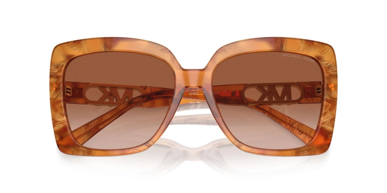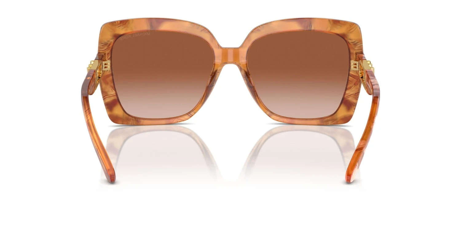 This square Michael Kors sunglass comes in a amber graphic tortoise frame with light brown gradient lenses.