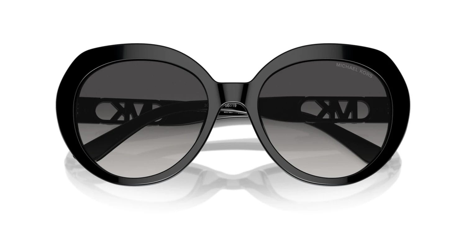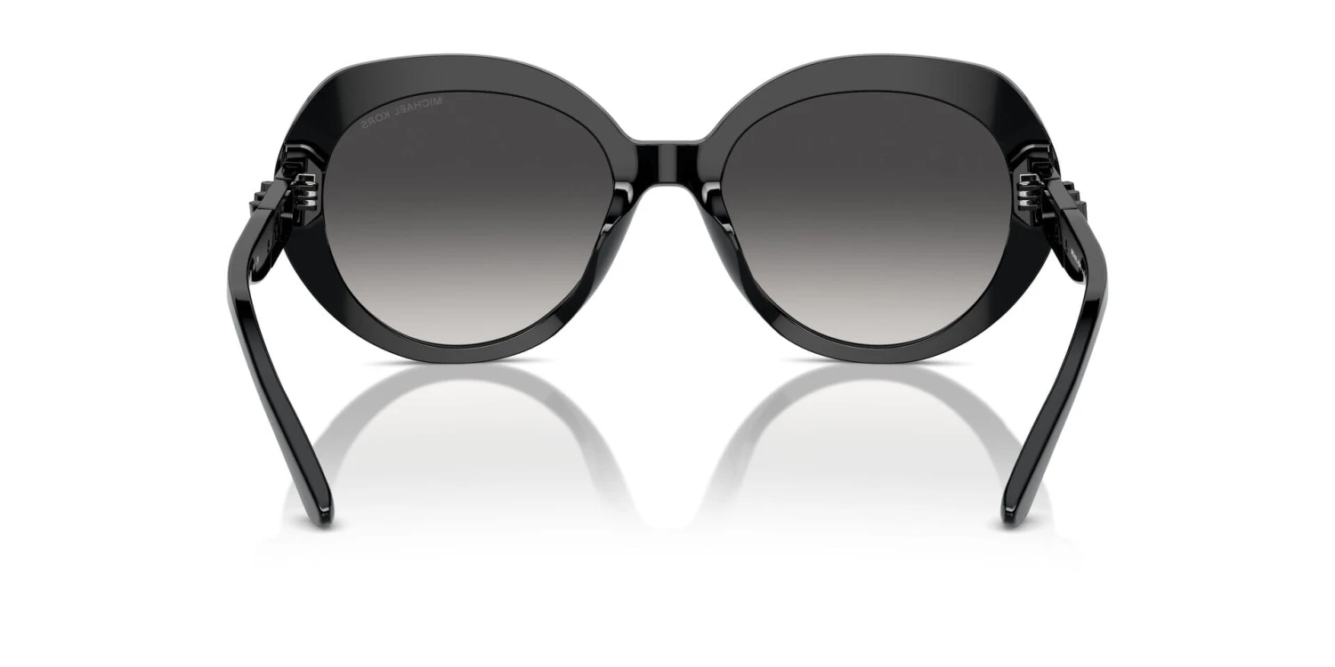 This round Michael Kors sunglass comes in a black frame with dark grey gradient lenses.