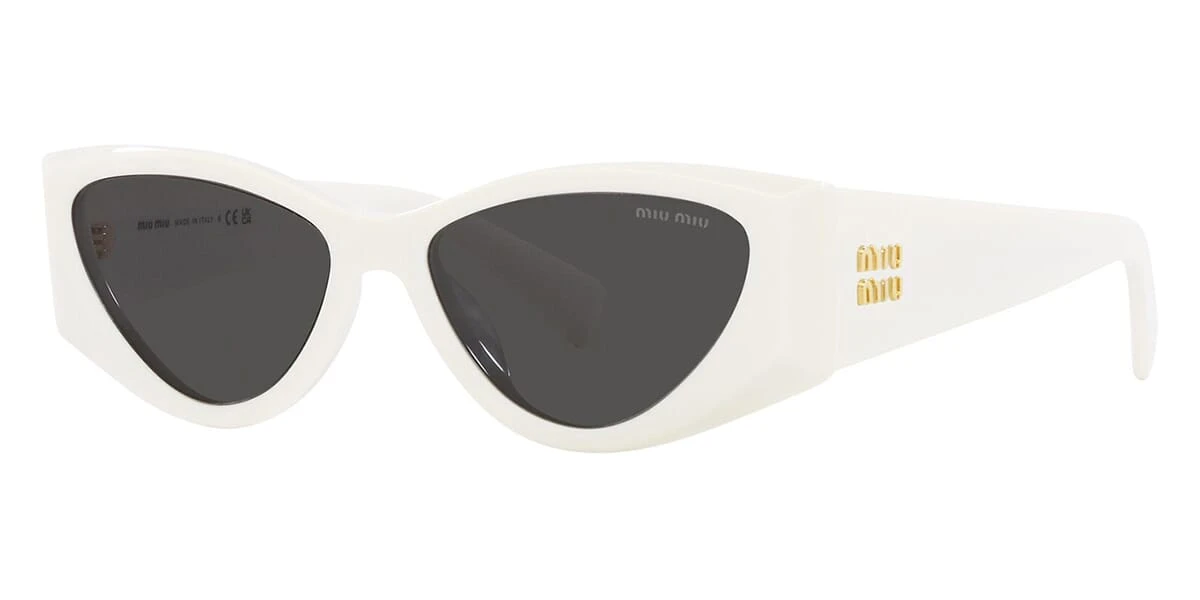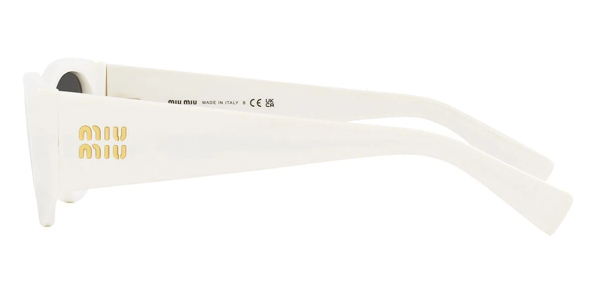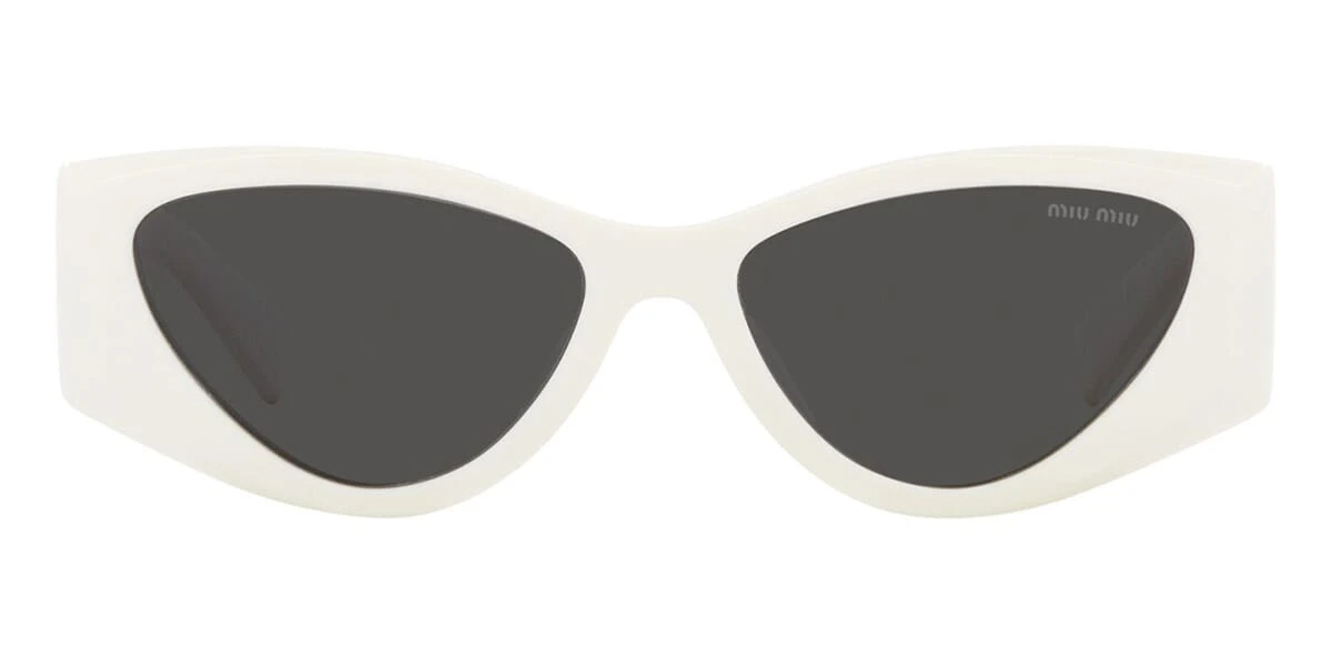 This cat eye Miu Miu sunglass comes in a white frame with dark grey lenses.