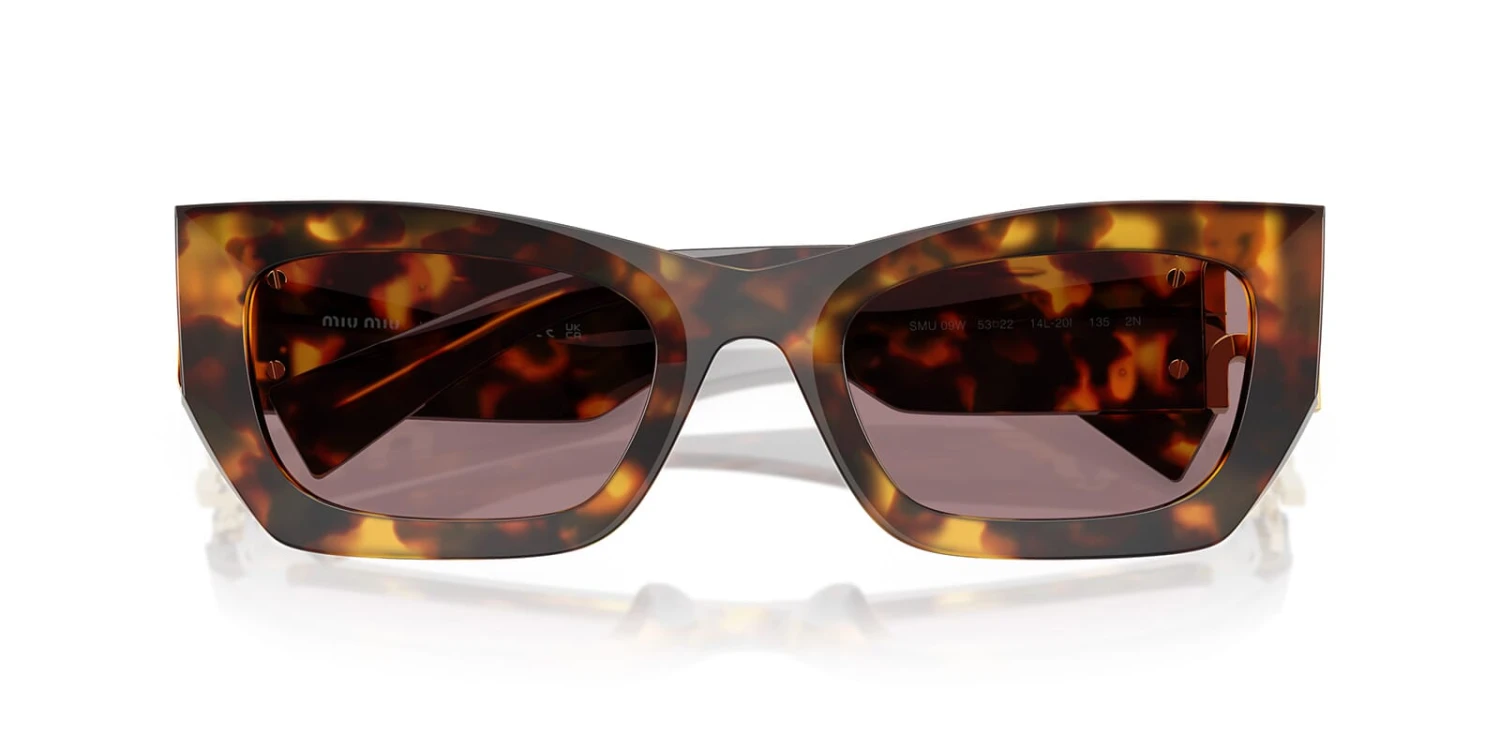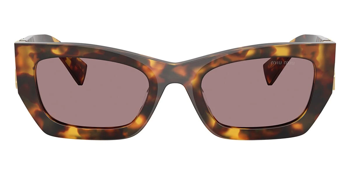This rectangular Miu Miu sunglass comes in a honey havana frame with light purple brown lenses.