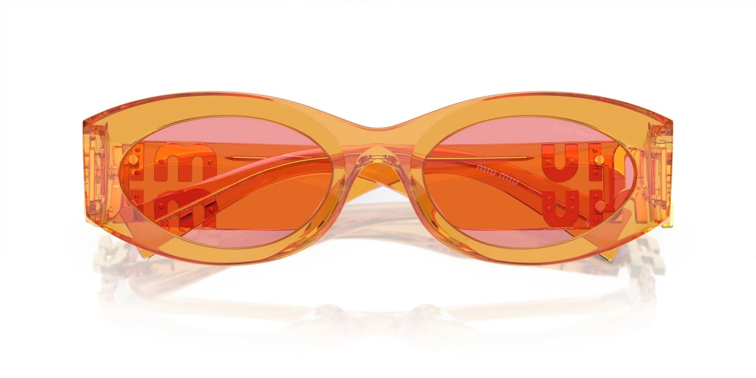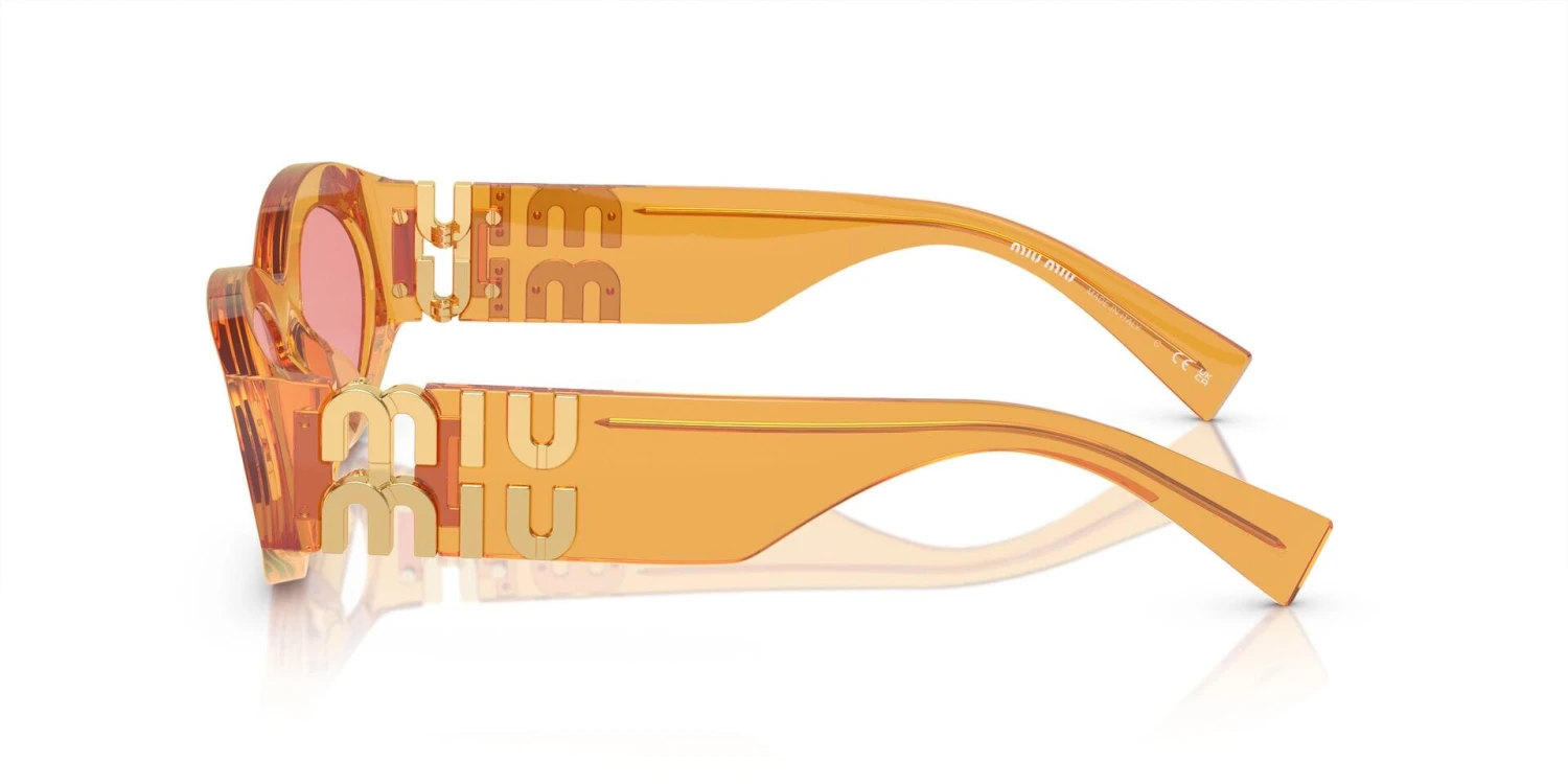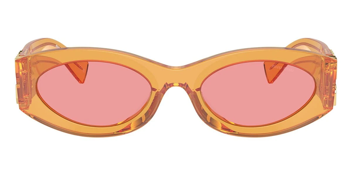 This round Miu Miu sunglass comes in a orange crystal frame with pink lenses.
