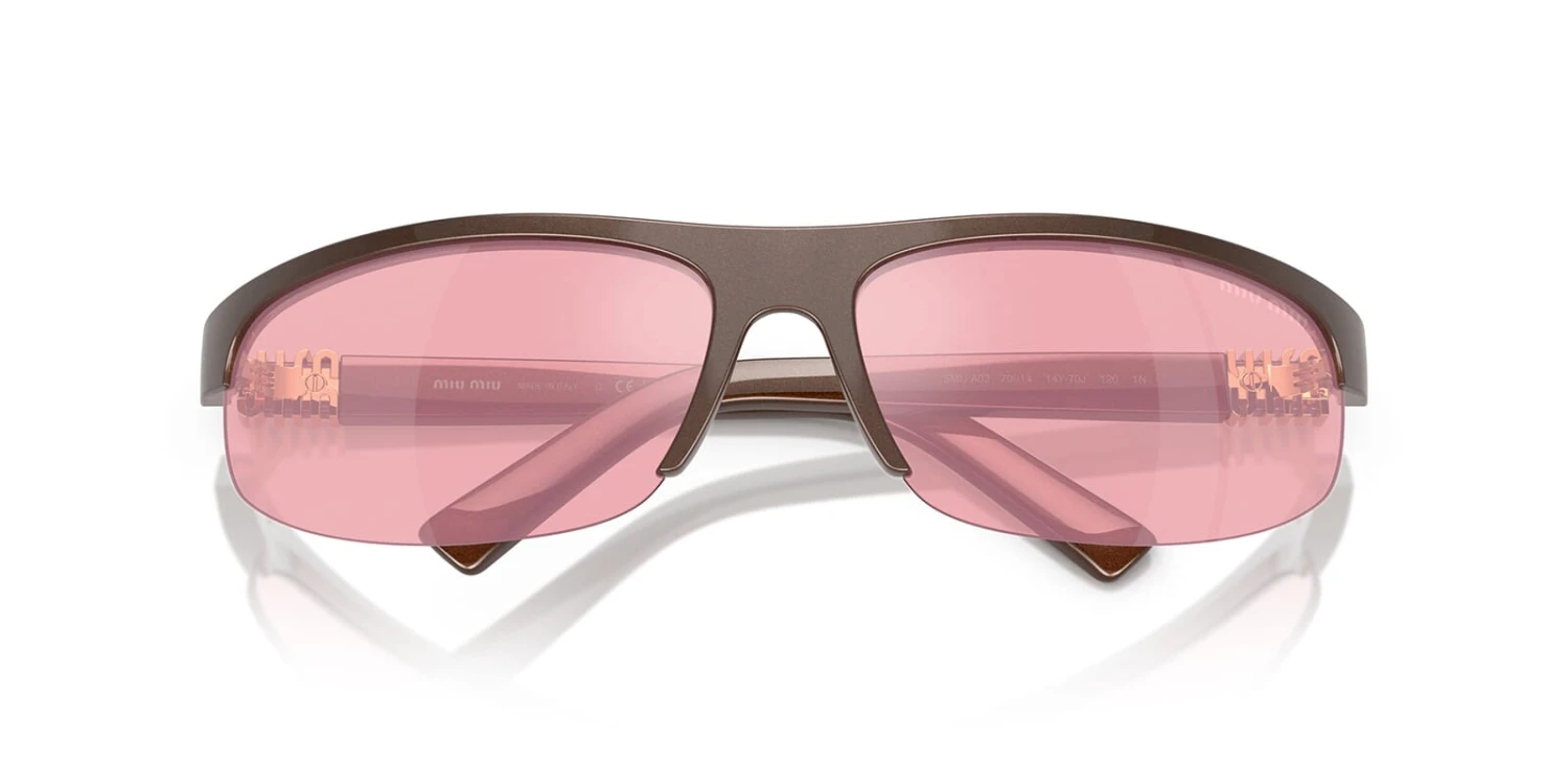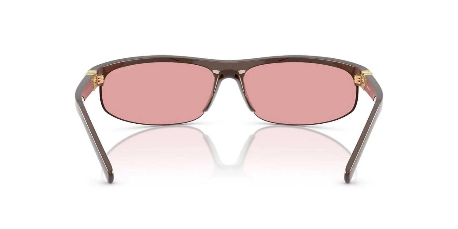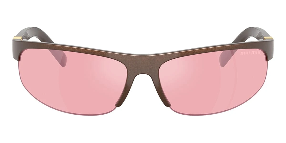This rectangular Miu Miu sunglass comes in a cocoa metal frame with pink with light mirror lenses.