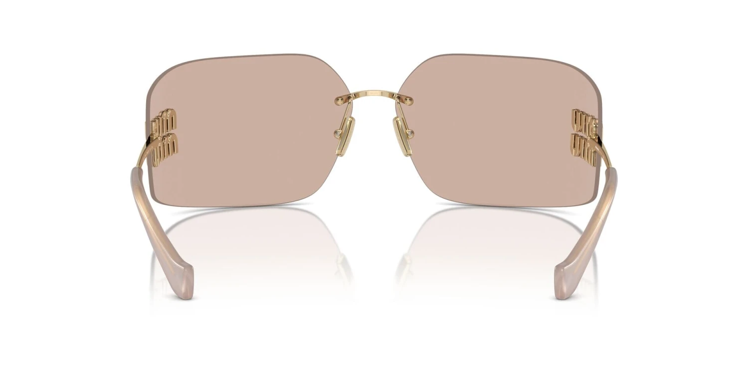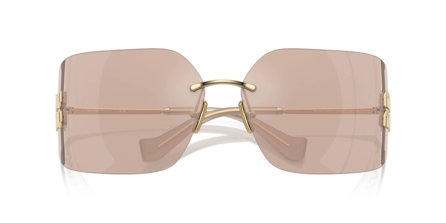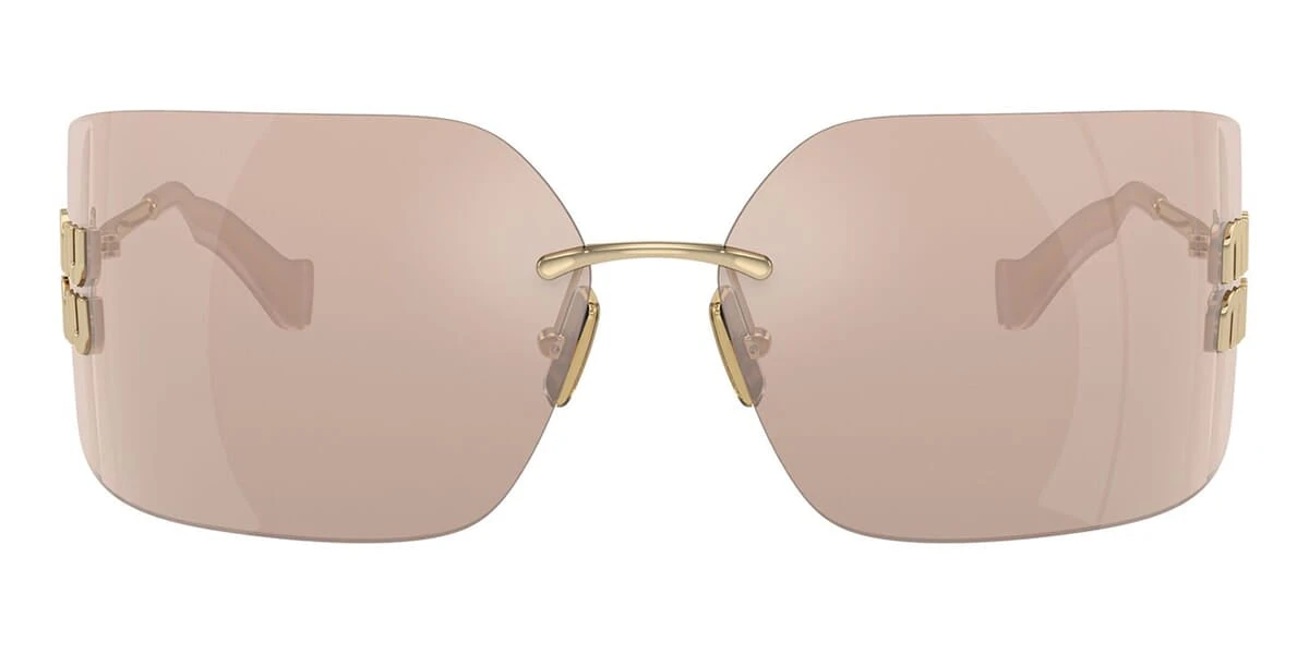 This rectangular Miu Miu sunglass comes in a pale gold frame with pink brown with light mirror lenses.