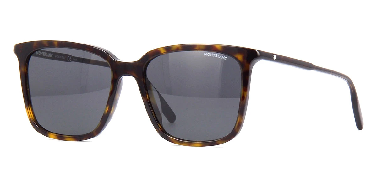 This square Montblanc sunglass comes in a havana frame with dark grey lenses.