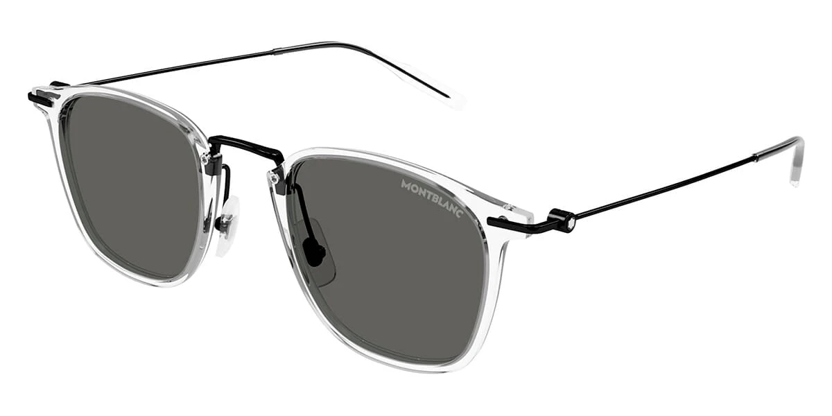 This square Mont Blanc sunglass comes in a crystal and black frame with grey lenses.