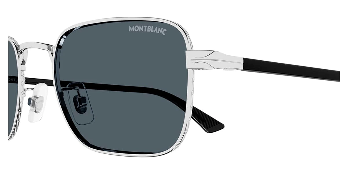 This square Mont Blanc sunglass comes in a silver with black frame with blue lenses.