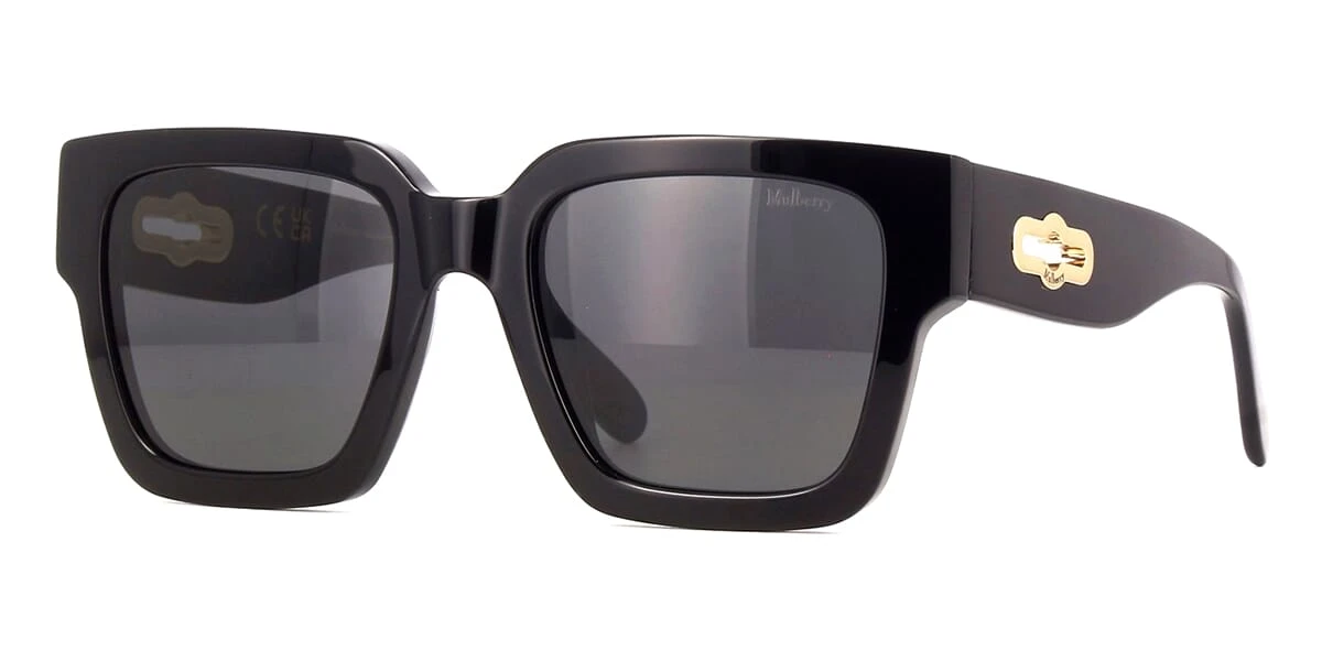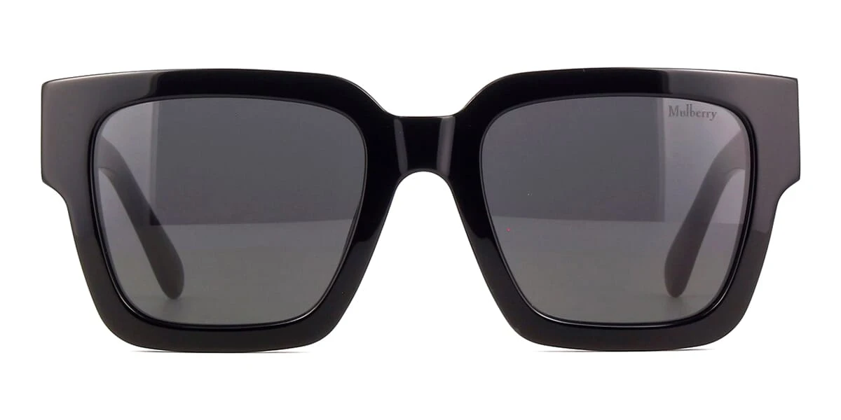 This square Mulberry sunglass comes in a shiny black frame with grey with light mirror lenses.