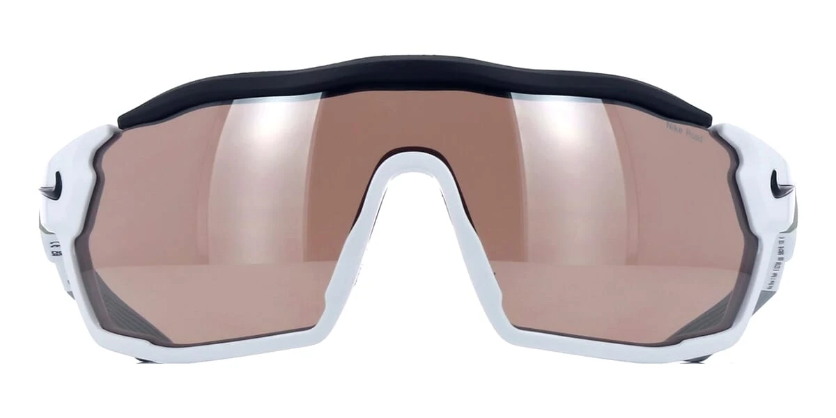 This shield Nike sunglass comes in a shiny white and matte black frame with light brown lenses.