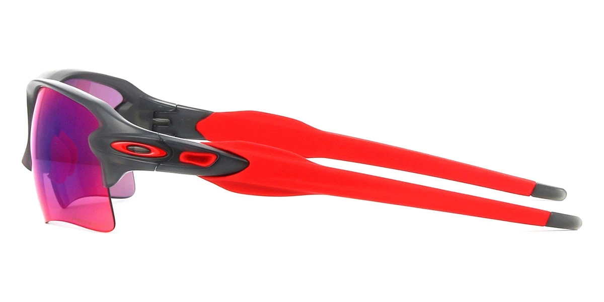 This wraparound Oakley sunglass comes in a matte grey smoke and red frame with prizm road lenses.