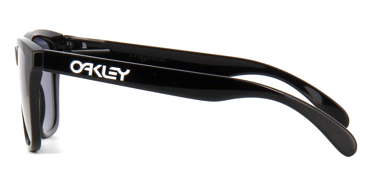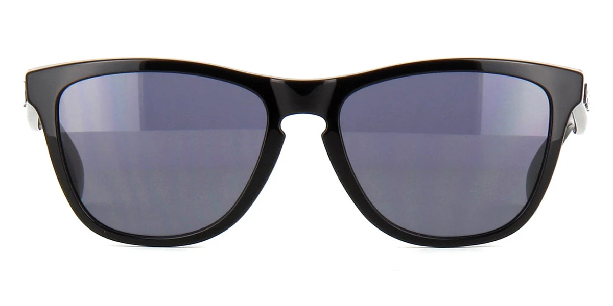 This wayfarer Oakley sunglass comes in a black frame with grey lenses.