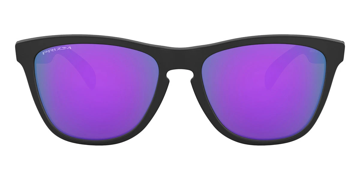 This square Oakley sunglass comes in a matte black frame with prizm violet lenses.