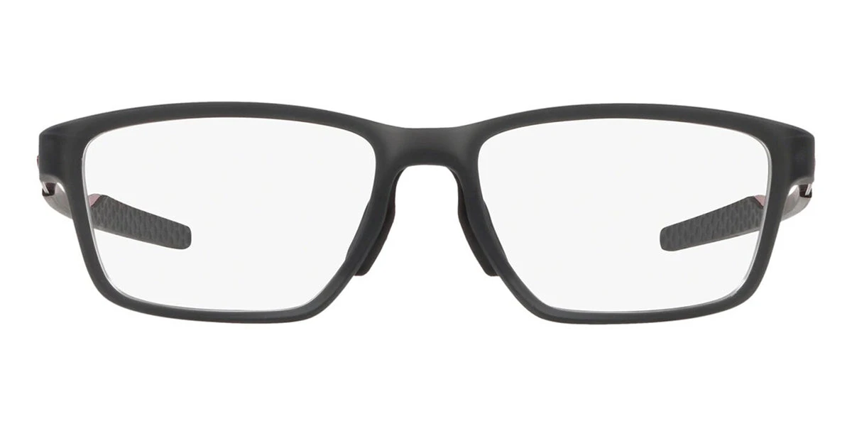 This rectangular Oakley optical comes in a satin grey smoke frame.