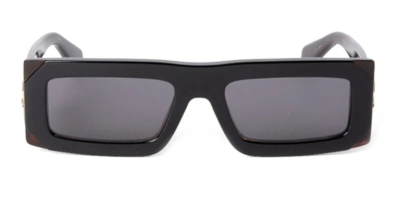 This square Off-White sunglass comes in a shiny black frame with grey lenses.