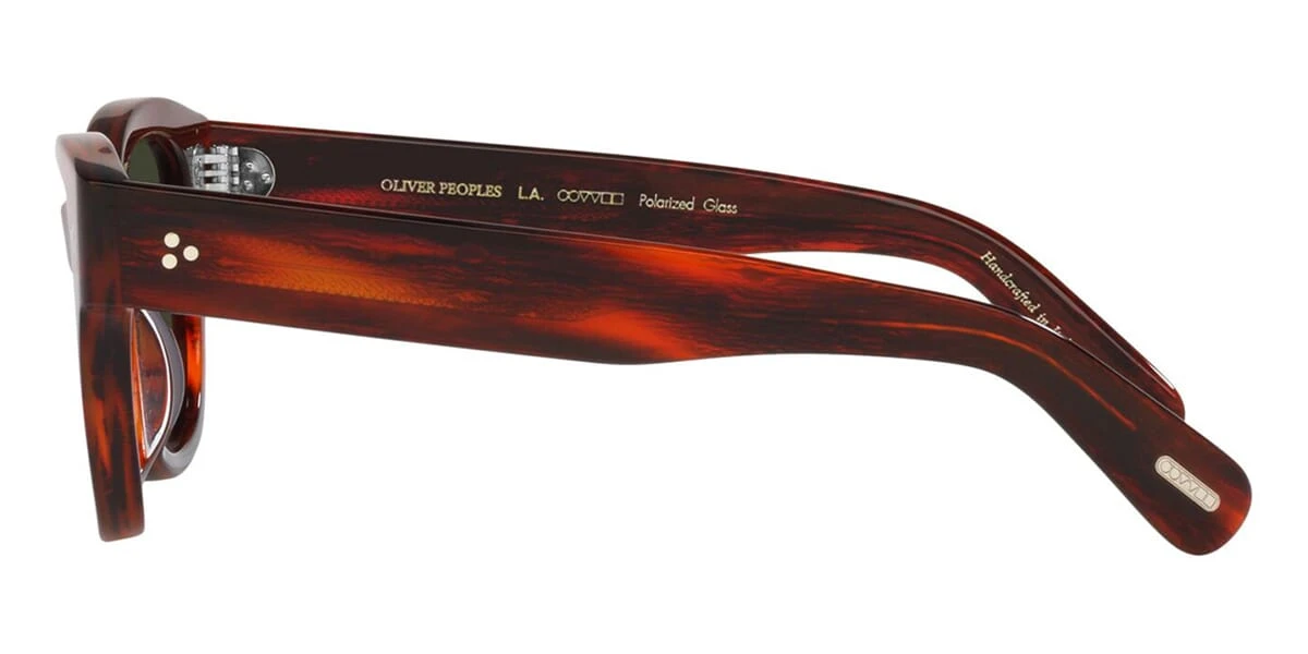 This rectangular Oliver Peoples sunglass comes in a vintage red tortoise frame with g-15 green polarised lenses.