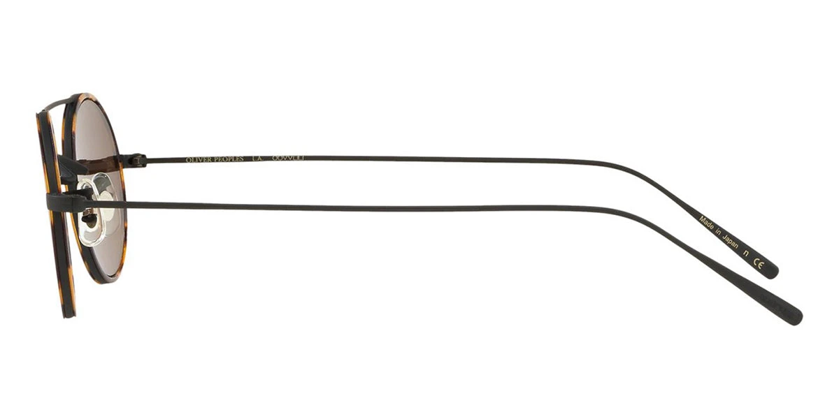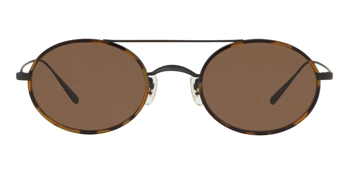 This round Oliver Peoples sunglass comes in a dtbk tortoise and matte black frame with brown lenses.