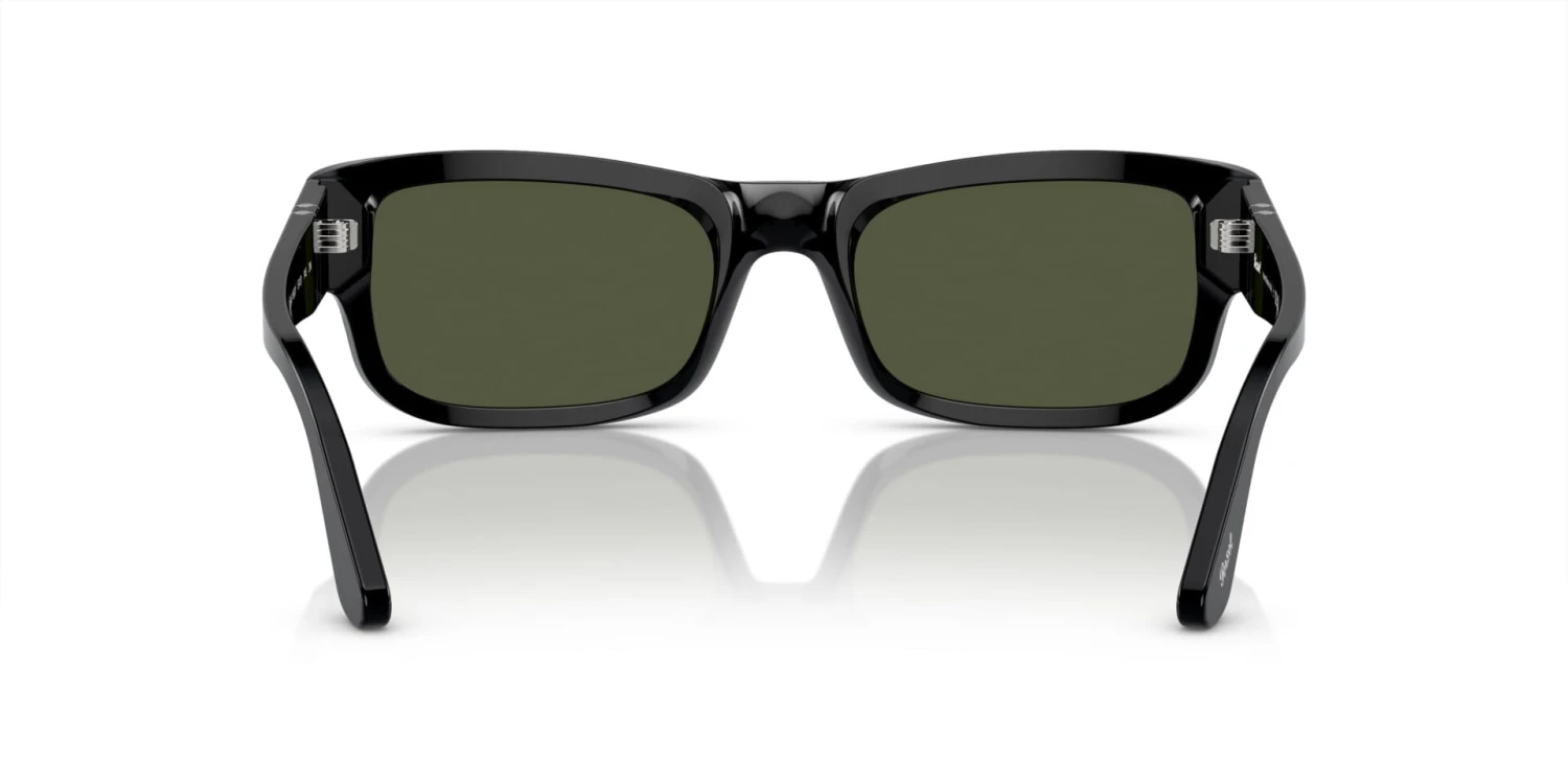 This rectangular Persol sunglass comes in a black frame with green lenses.