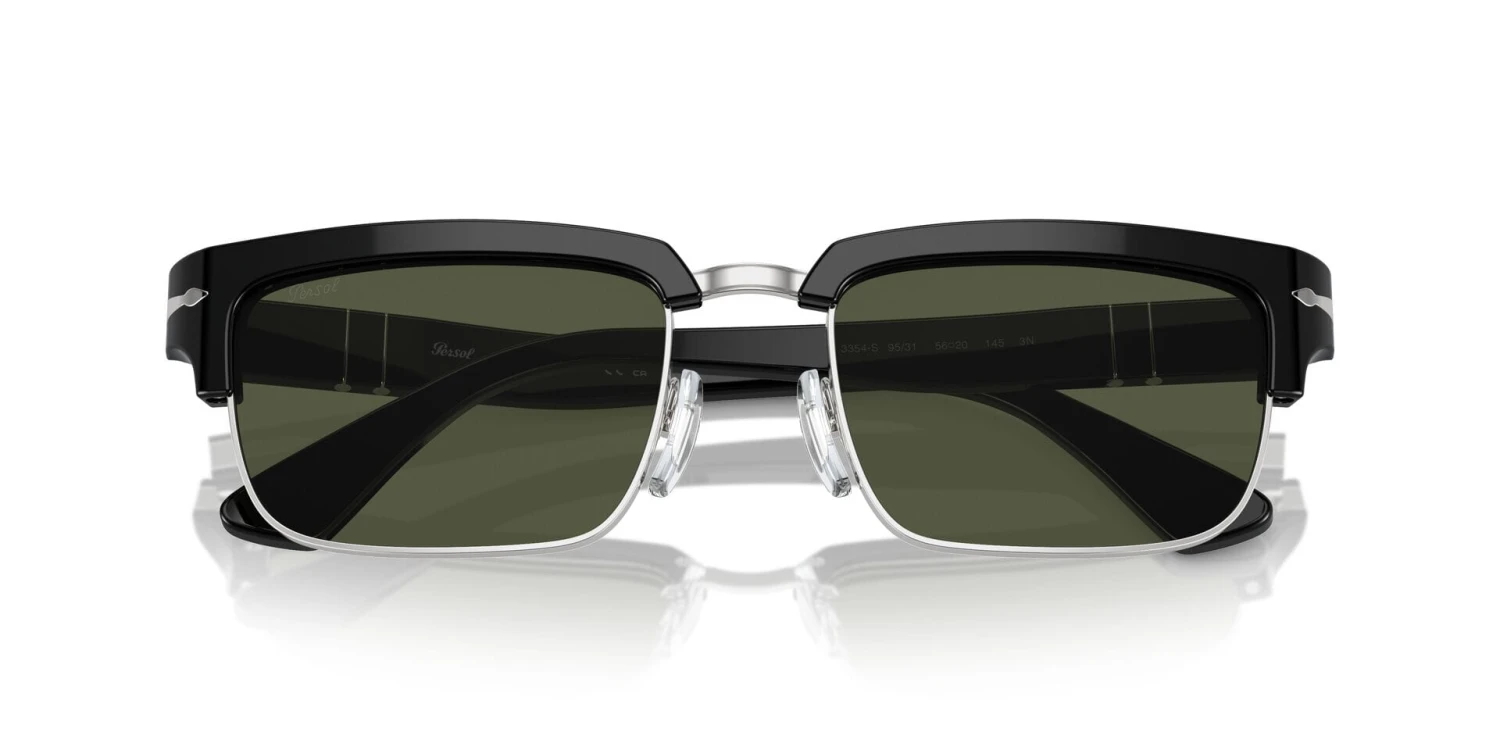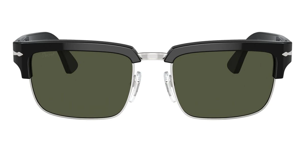 This rectangular Persol sunglass comes in a black and silver frame with green lenses.