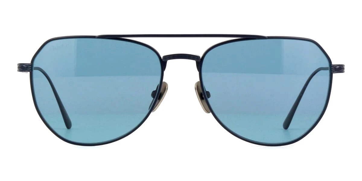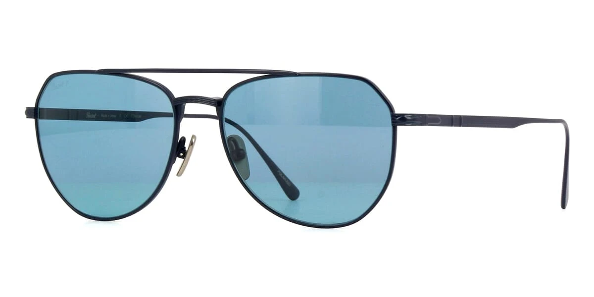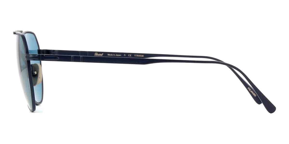 This aviator Persol sunglass comes in a dark satin blue frame with blue polarised lenses.