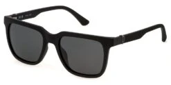 This square Police sunglass comes in a matte black frame with grey lenses.