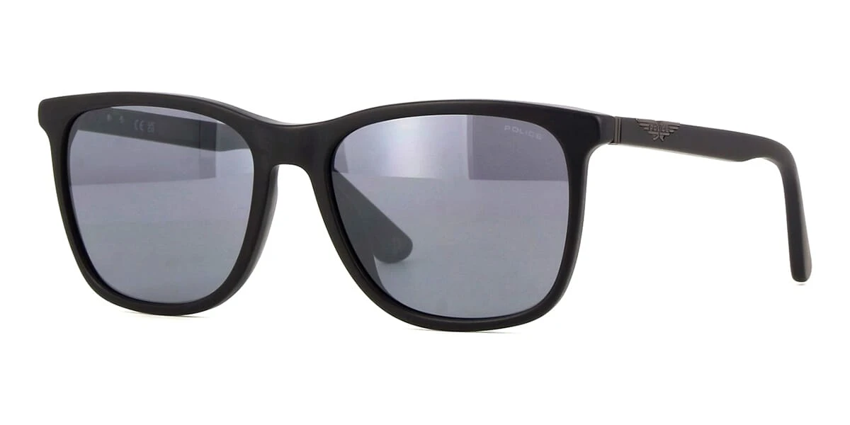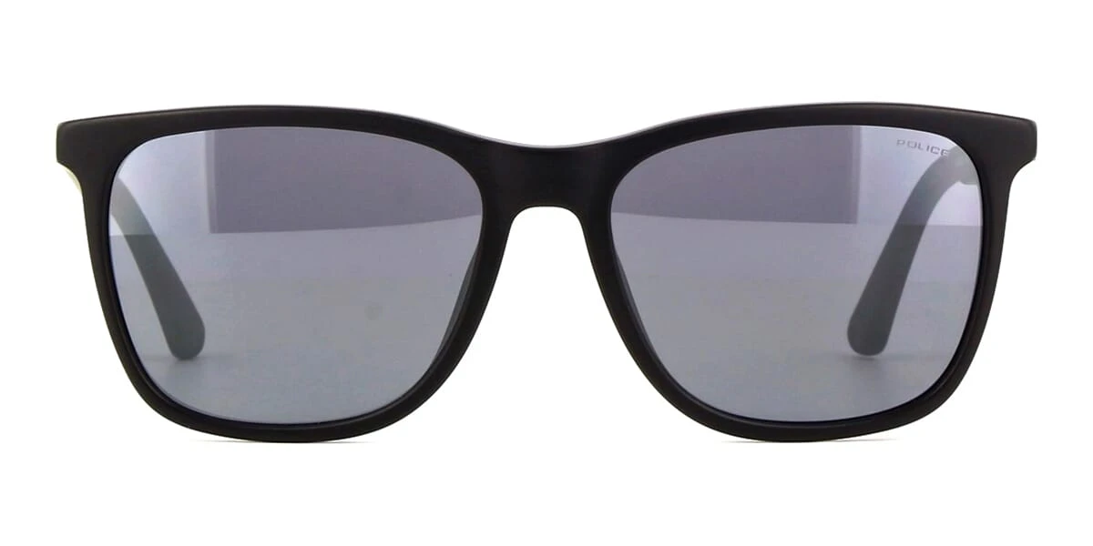 This square Police sunglass comes in a matte black frame with grey lenses.