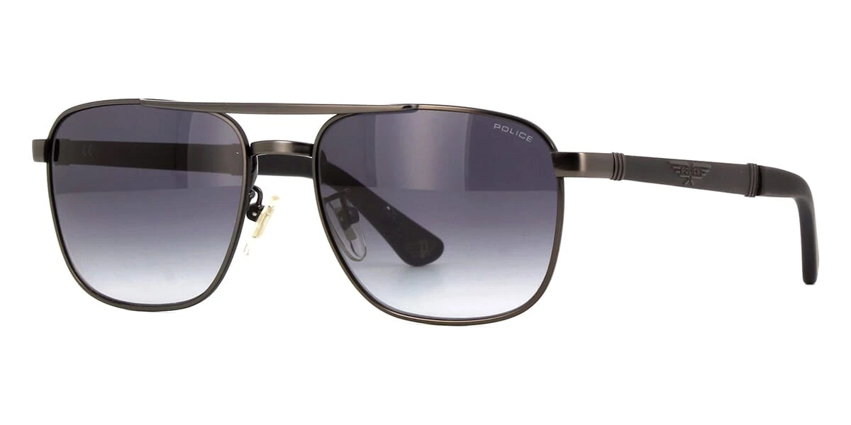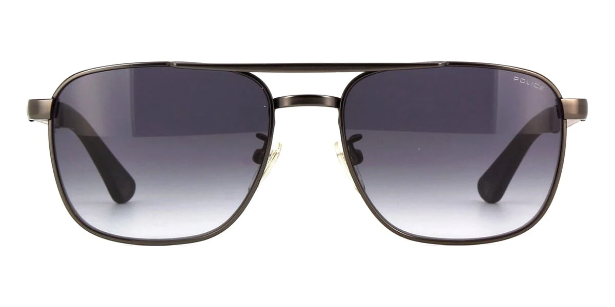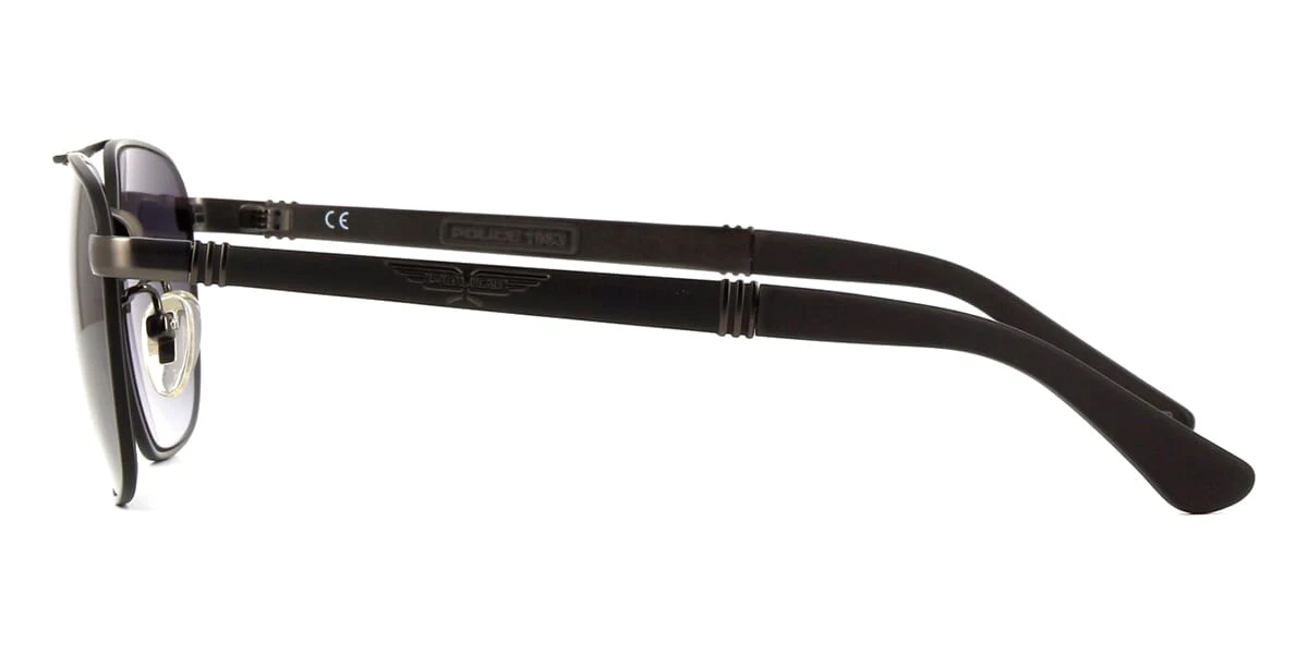 This square Police sunglass comes in a matte black frame with grey gradient with light mirror lenses.