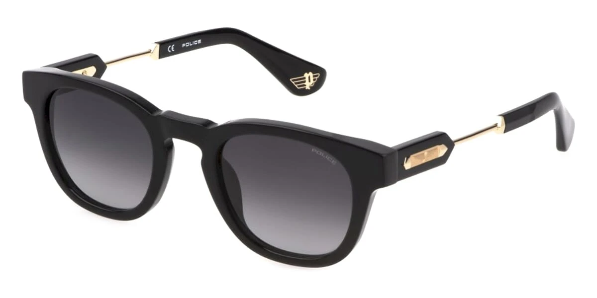 This square Police sunglass comes in a shiny black with gold frame with smoke grey gradient cat 3 lenses.
