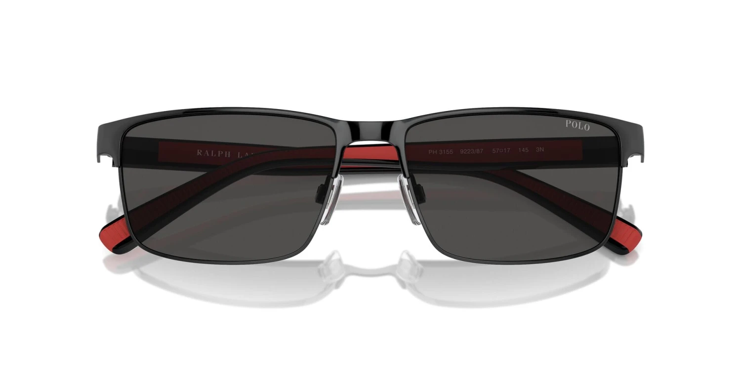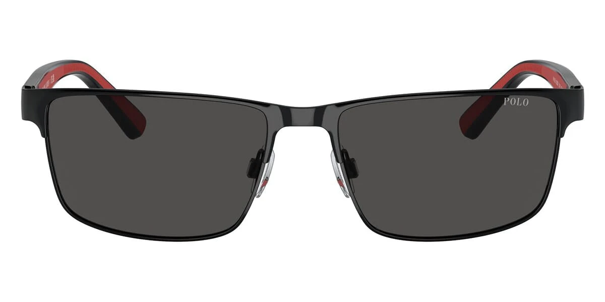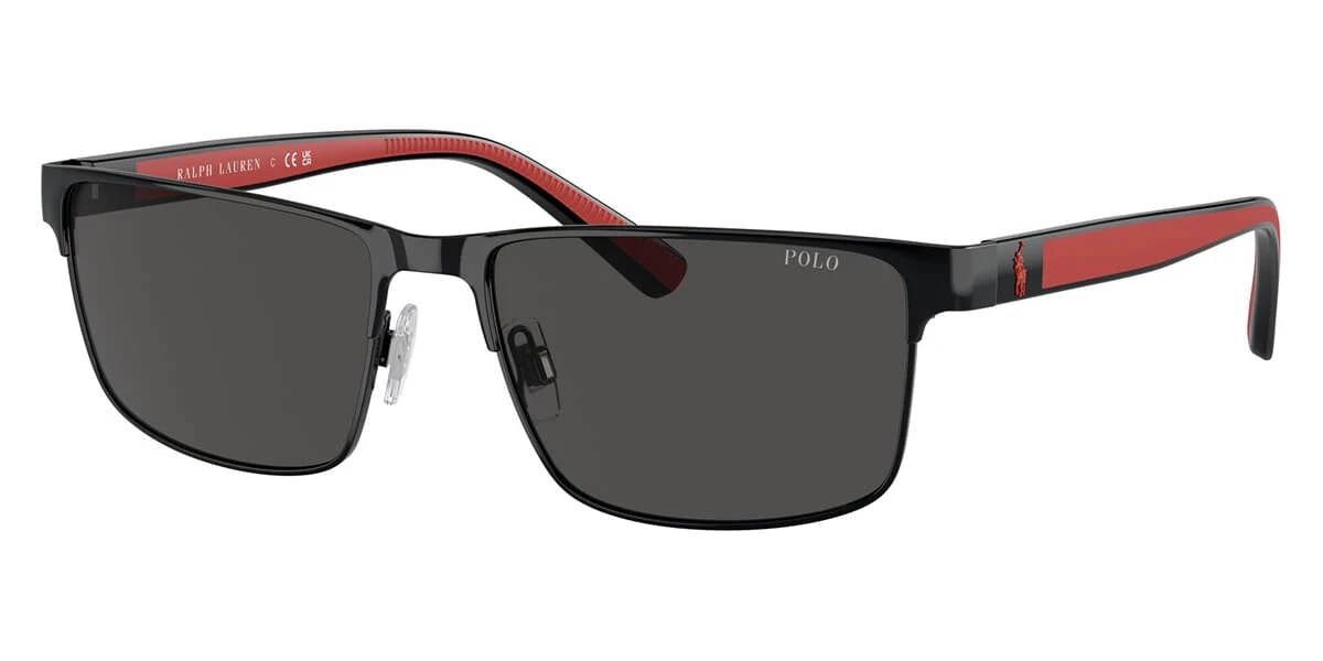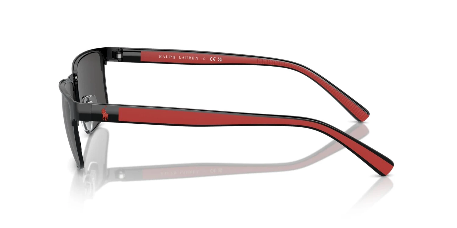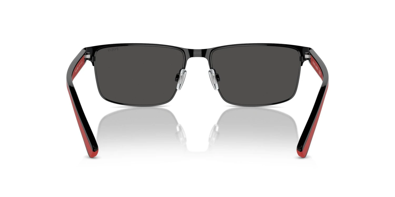 This rectangular Polo sunglass comes in a shiny black frame with dark grey lenses.