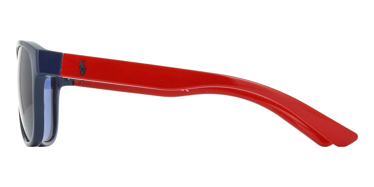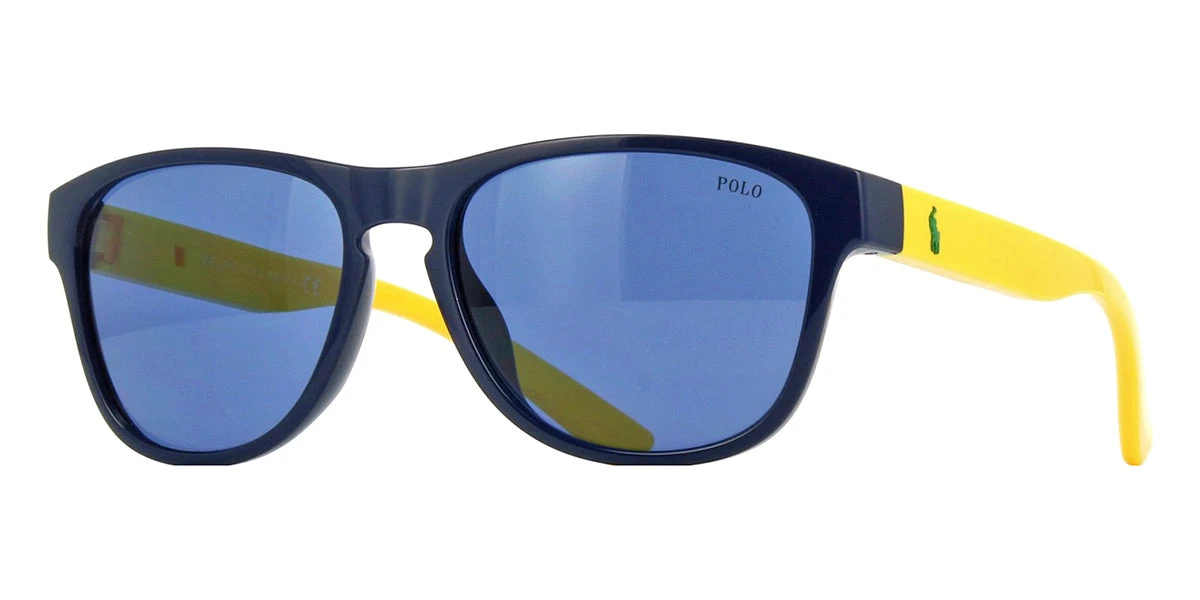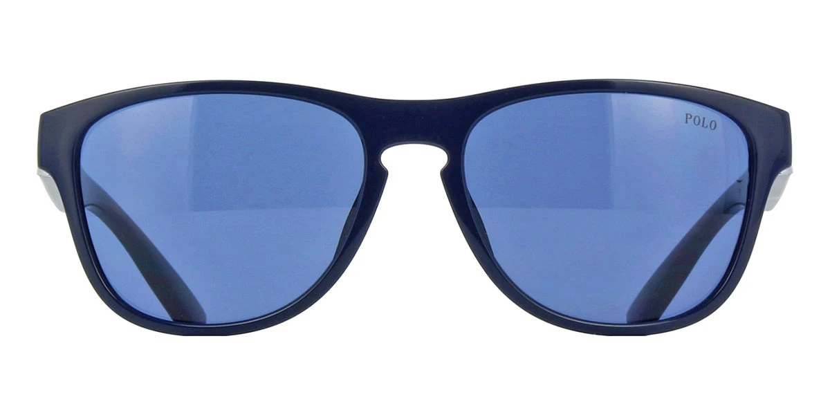 This rectangular Polo sunglass comes in a shiny navy blue frame with dark blue lenses.