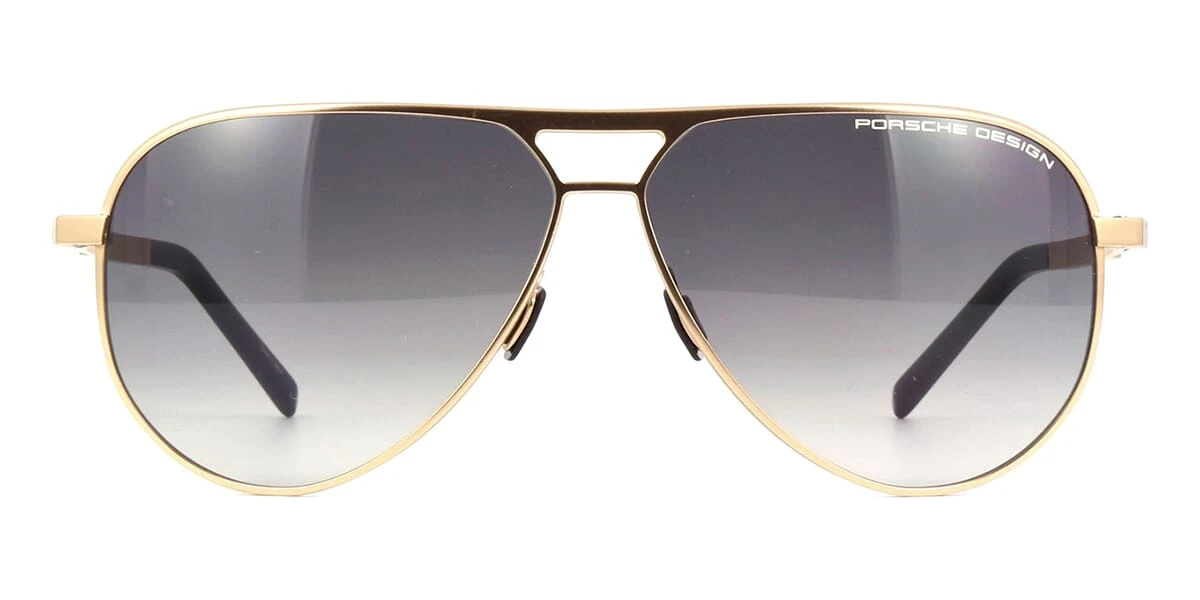 This aviator Porsche Design sunglass comes in a satin gold frame with grey gradient with light mirror lenses.