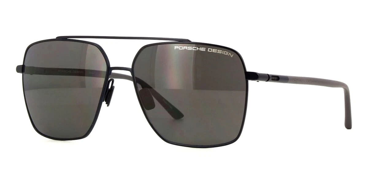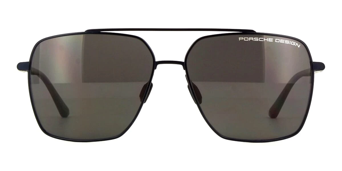 This square Porsche Design sunglass comes in a matte blue frame with grey with light mirror polarised lenses.